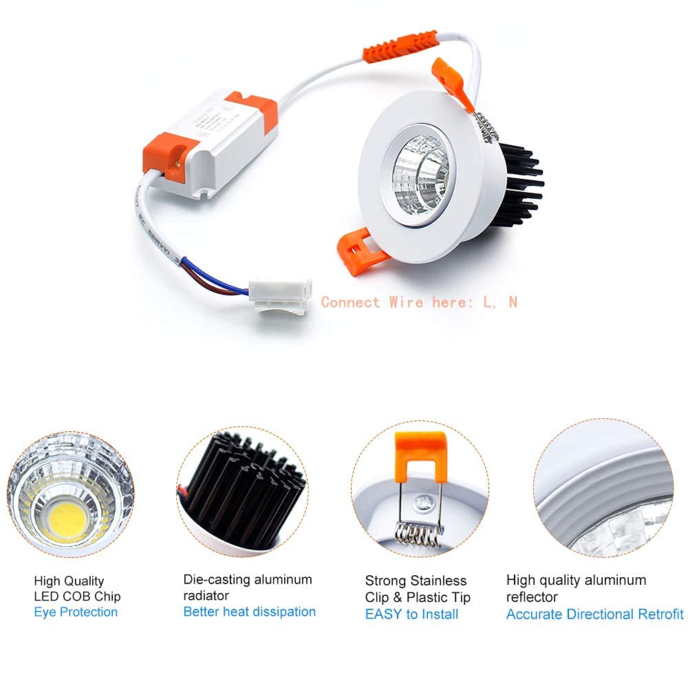 Features: No Ultraviolet Rays, Infrared Radiation And Heat Radiation. This Downlight Bulb Is Advanced Lighting Goods With Energy-Efficient,Aesthetic And Anti Glare. With Perfect Color And Soft Lighting Specification: Power: 3W Input Voltage: 110V-130V Ac Emitting Color: 4000K Natural White Light Source: Led Dimmable: Dimmable Brightness: 220Lm Cri: 80+ Front Diameter: 68Mm/2.67Inch Cutout Opening Diamerter: 51Mm/2 Inch Package Includes: 6 * 3W Dimmable Led Ceiling Lights