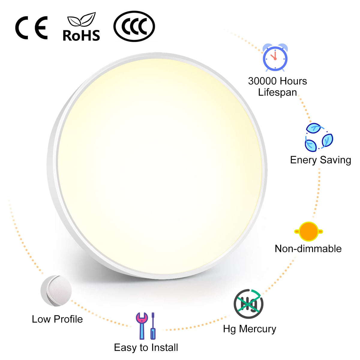 This ceiling light features a durable construction made from well-made plastic (ABS+PS) materials. Its round design, measuring 15.7 inches in diameter and only 0.94 inches thick, allows it to blend seamlessly with various interior decor styles. The 32W powerful LED light source emits a bright 3800 lumens of natural white light (4000K), making it suitable for a range of applications, including bedrooms, living rooms, kitchens, and offices. The lights average lifespan of 30,000 hours ensures long-lasting performance, reducing the frequency of replacements.