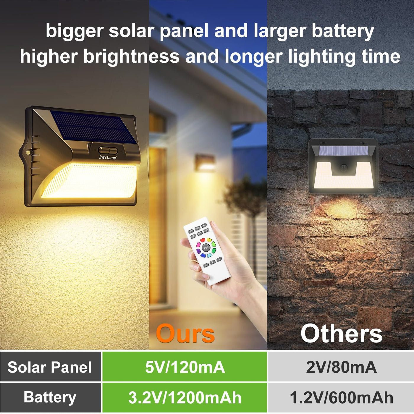 Q: How Is The Solar Panel? A: This Solar Wall Light Utilizes Premium Monocrystalline Silicon For Optimal Quality With More Than 20% Conversion Efficiency. Q: How Long Does It Take To Fully Charge, And How Long Can It Use? A: When Placed In Direct Sunlight, The Light Charges Fully In Around 9 Hours And Provides Up To 20 Hours Of Continuous Use On A Full Charge. Q: How Is The Intelamp Solar Deck Light Operated? A: The Intelamp Solar Deck Light Can Be Operated Manually Using The Light Itself Or Through A Remote Control To Select Colors, Modes, Adjust Brightness, And Set Timers. Make Sure The On Switch On The Light Is Turned On For Proper Functionality. Q: Where Can This Solar Fence Light Be Installed? A: This Solar Light Can Be Installed On Decks, Walls, Step, Stairs, Fence, Patio, Garden, Porch And Various Outdoor Locations. Q: How To Maintain The Light? A: Regular Cleaning And Ensuring The Solar Panel Is Free Of Debris Are Essential For Maintenance. Q: Anything Need To Be Concerned When Install? A: Do Not Install In Areas Where Direct Sunlight Cannot Reach Or Where The Light Is Exposed To Direct Artificial Light At Night. Q: Can This Solar Light Be Used On Stairs, Steps Or Pathways? A: The Intelamp Solar Fence Light Can Be Effectively Used On Stairs, Steps And Pathways. Q: How Is The Brightness Of This Solar Light? A: The Brightness Of The Intelamp Solar Fence Light Is Suitable For Creating A Pleasant Ambiance In Outdoor Spaces. Q: How Long Can This Solar Light Operate In Overcast Or Rainy Conditions? A: This 1200Mah Light Charges Fully In 9 Hours And Can Run For 20 Hours On A Full Charge. Typically, Even In Overcast Or Rainy Conditions, It Can Still Operate For An Extended Period. Adjusting Settings Or Allowing It To Charge For A Day Or Two Can Ensure It Remains Functional During Consecutive Cloudy Or Rainy Days. Q: Is This Solar Light Energy-Efficient? A: The Intelamp Solar Deck Light Is Designed To Be Energy-Efficient, Utilizing Solar Power For Illumination.
