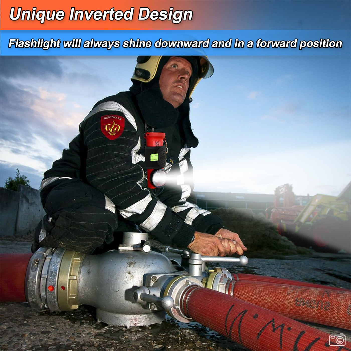Q: How does the unique inverted design benefit flashlight usage?A: The unique inverted design keeps the flashlight shining downward and in a forward position, allowing for flexibility when changing body positions, such as walking, kneeling, or crawling, which is essential during emergency situations.