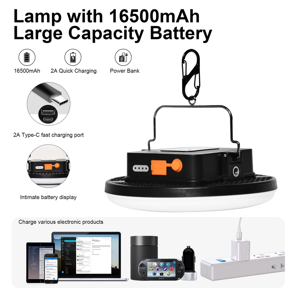 Q: How long does the battery last on a full charge?A: The 16500mAh battery can maintain the highest brightness of 3000 lumens for up to 24 hours on continuous use. In the lowest brightness setting, it can last over 100 hours, making it ideal for extended outdoor activities.