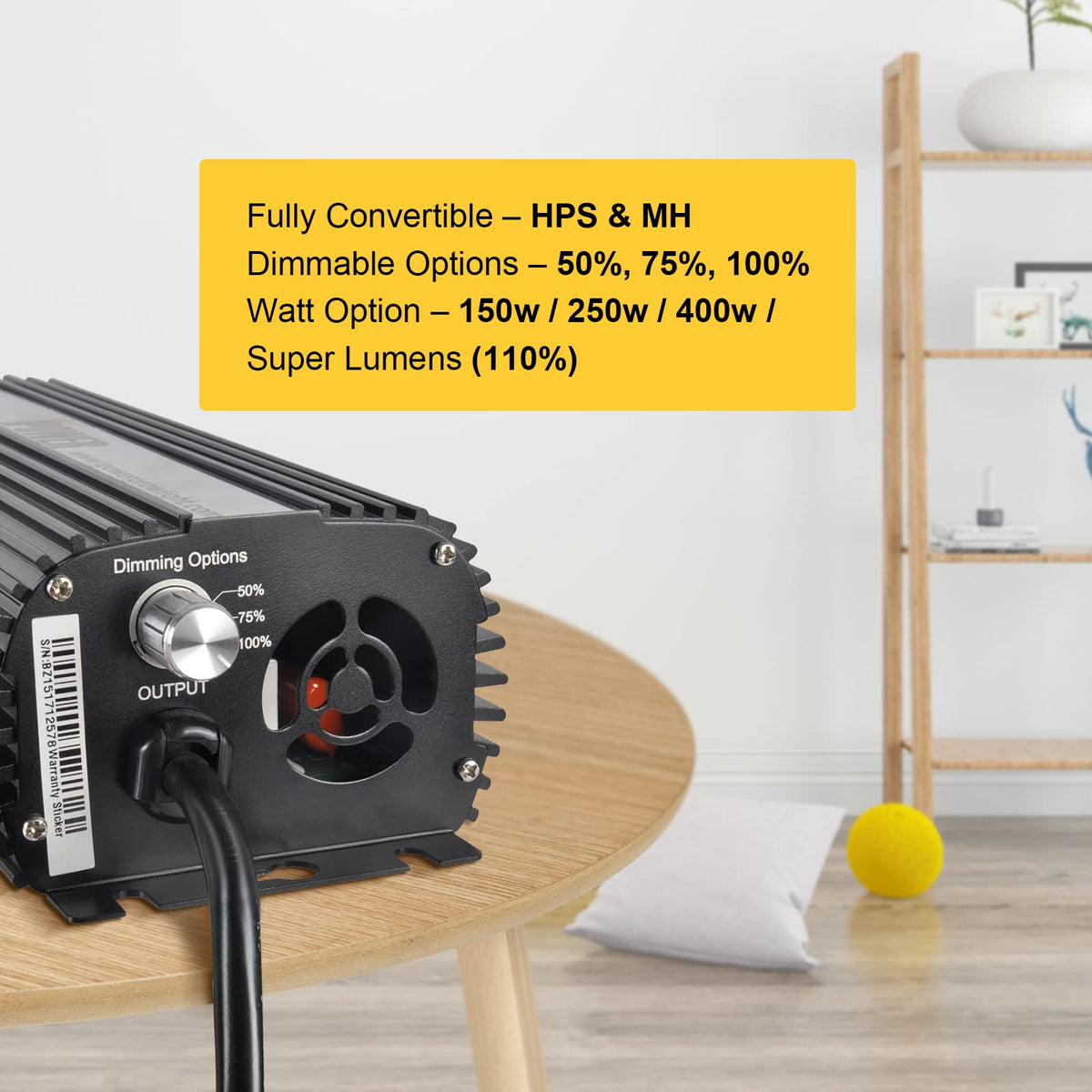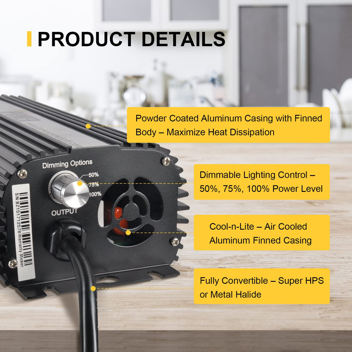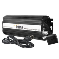 Product DescriptionThe iPower's high operating frequency not only ensures continuous power delivery, but also has conserving bulb life in mind. As efficient and powerful as the iPower is, its silent operation and light weight design adds to the maximum lumen any plant will ever need. This iPower Digital Ballast features: High power factor High luminous efficiency Adjustable wattage output Zero acoustic resonance Internal RF protection Internal Resin coating for long life Convertibility between HPS and MH lightbulbs Conveniently wired with standard hydroponic ''S'' plug Stable light output by constant lamp voltage, lamps will be flicker free. Anodized aluminum fins for maximized heat dissipation Sunlight Supply (Brand S) style output plug (Hydro farm fixtures will need BAASP adapters)Each Ballast Comes with: 1x Dimmable digital ballast 1x Heavy duty power cord (a $10 value FREE from us) 1x Operating manualSpecifications: Operating Temperature: -40~ 65 Operating Voltage Range: 100V ~ 265V Power Supply Frequency: 47 ~ 63 Hz Operating Frequency: 25~100 kHz Power Factor: > 0.99 Total Harmonic Distortion (THD):