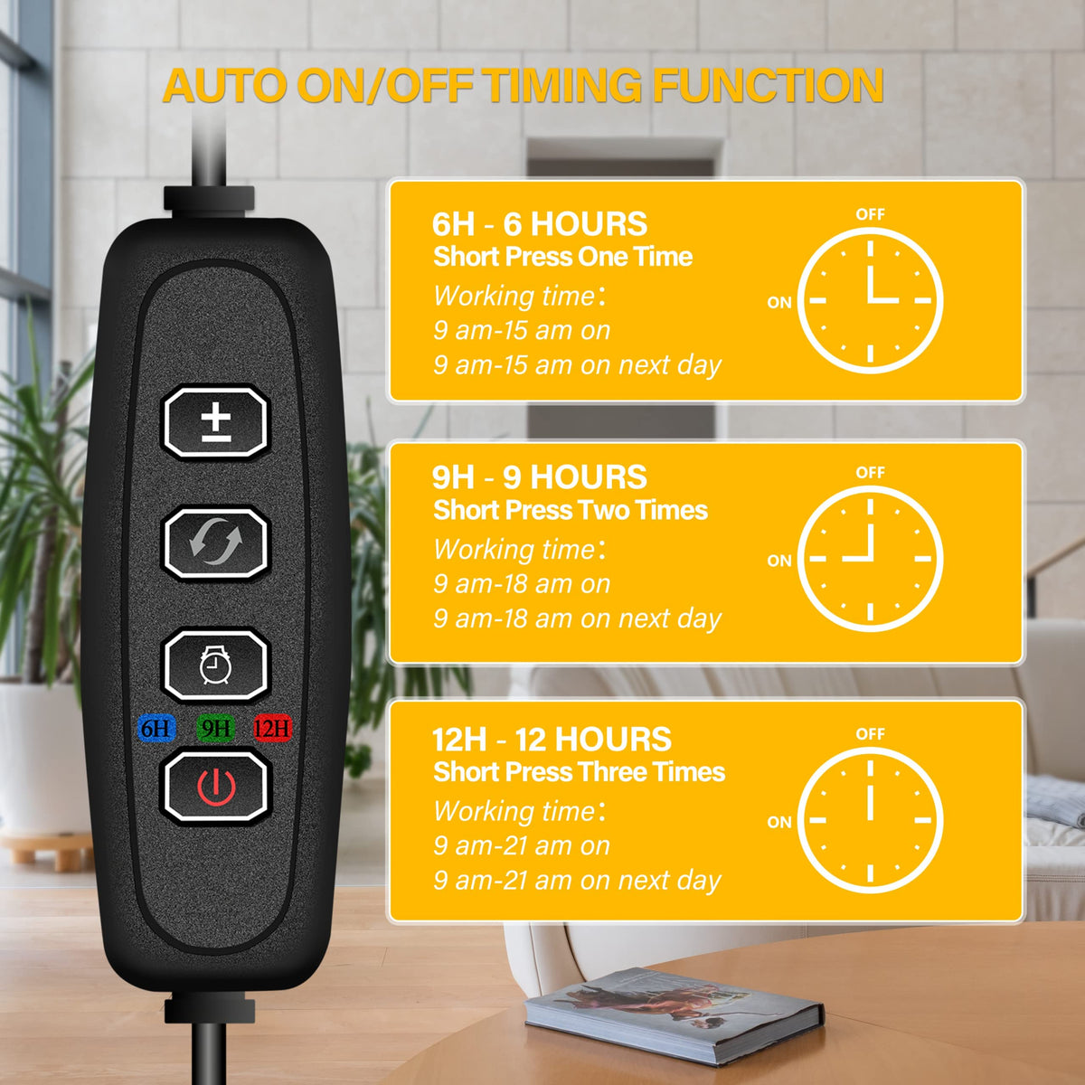 - **Versatile Timer Function**: Equipped with a timer that allows you to set 6, 9, or 12-hour intervals, ensuring your plants receive the right amount of light without the worry of manual operation. This feature is perfect for maintaining a consistent light schedule for optimal growth.