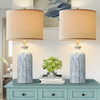 Q: What materials are used in the construction of these lamps?A: The lamps are made from high-quality ceramic with uniquely carved patterns and feature a linen shade.