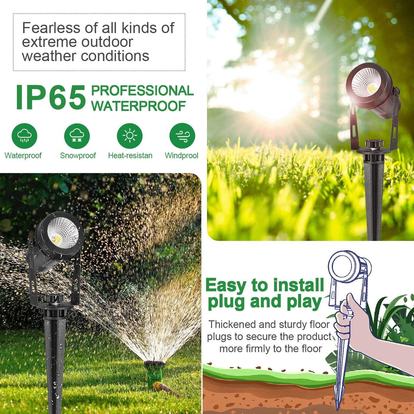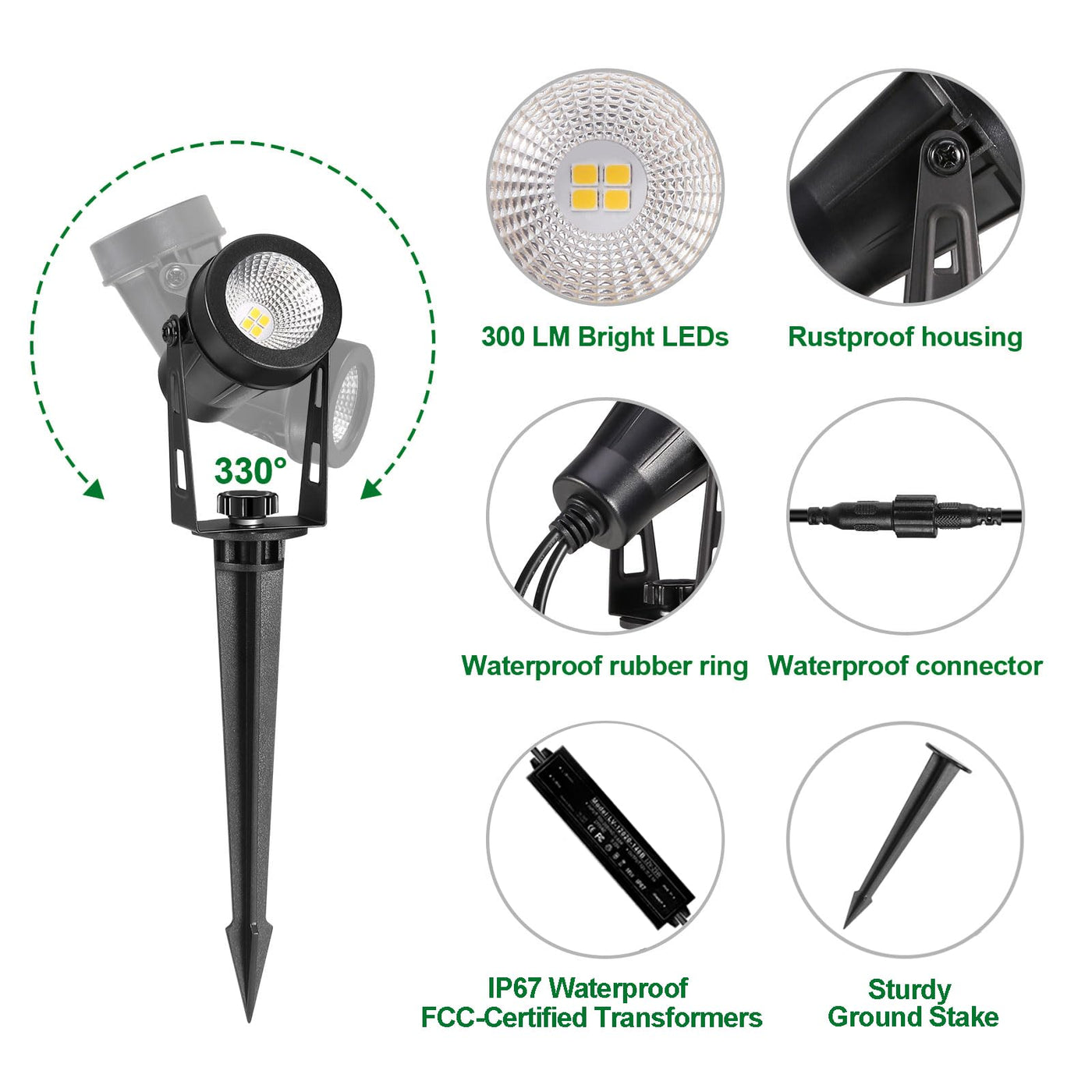 Iriseco Low Voltage Landscape Lighting, 6 Pack Outdoor Spot Lights With Transformers, 12V Warm White Landscape Spotlights Ip65 Waterproof Plug In Outdoor Uplights For Yard House Pathway Tree Pools Product Features 69Ft Ultra Long Extension Wire 12 Volt Safe Low Voltage Uv-Resistant Abs Material, Lighter And More Compact, More Suitable For Concealed Installation. Ip65 Waterproof Garden Lights Tool-Free Installation & Plug And Play & Wall-Mounted And Ground Inserted Perfect Christmas And Halloween Decor 1800Lm 2700K 18W Super Bright & Energy Saving, Uniform Light Emission, Eye Protection. Specifications Wattage: 3W Per Light Luminous Flux: 1800Lm Voltage: 12V Material: Abs Item Weight: 2.43 Pounds Transformer Wattage: 25W Cri>80 Package Includes Adapter*1 Ground Spike*6 Spotlights*6 Hand-Adjustment Nuts*6 Round Spacers*6 Instruction Manual*1