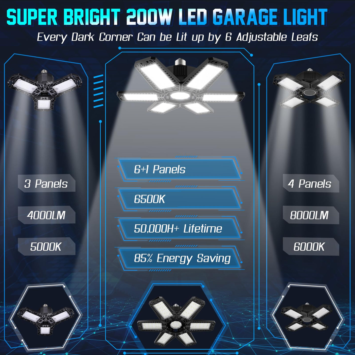 Iskydraw Garage Light, 6 Pack Garage Lights Ceiling Led 200W 20000Lm Garage Lighting 6500K With 6+1 Deformable Panels, Shop Ligh