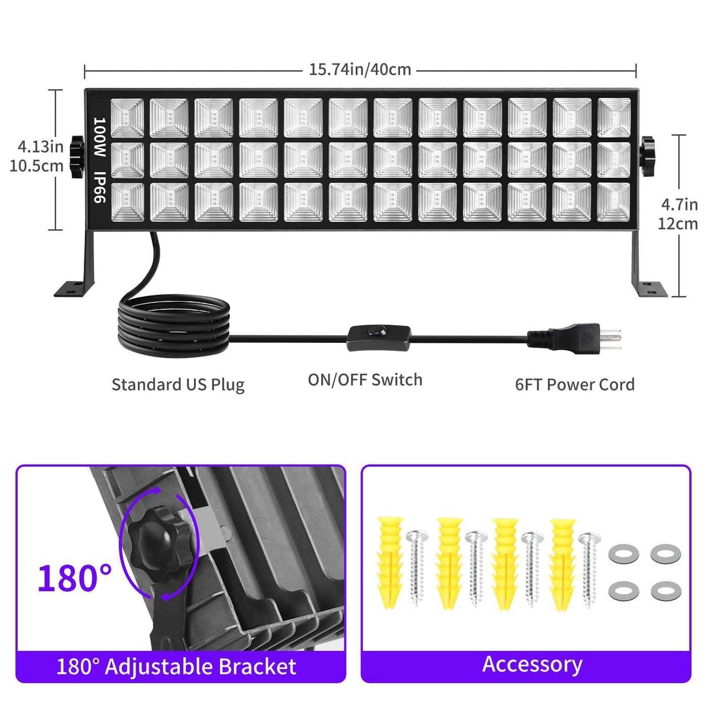 - **High-Performance Illumination**: Equipped with 100 high-quality LEDs, this 100W black light bar delivers bright, expansive coverage with a 120-degree wide beam angle, ensuring that your designated areas are fully illuminated.