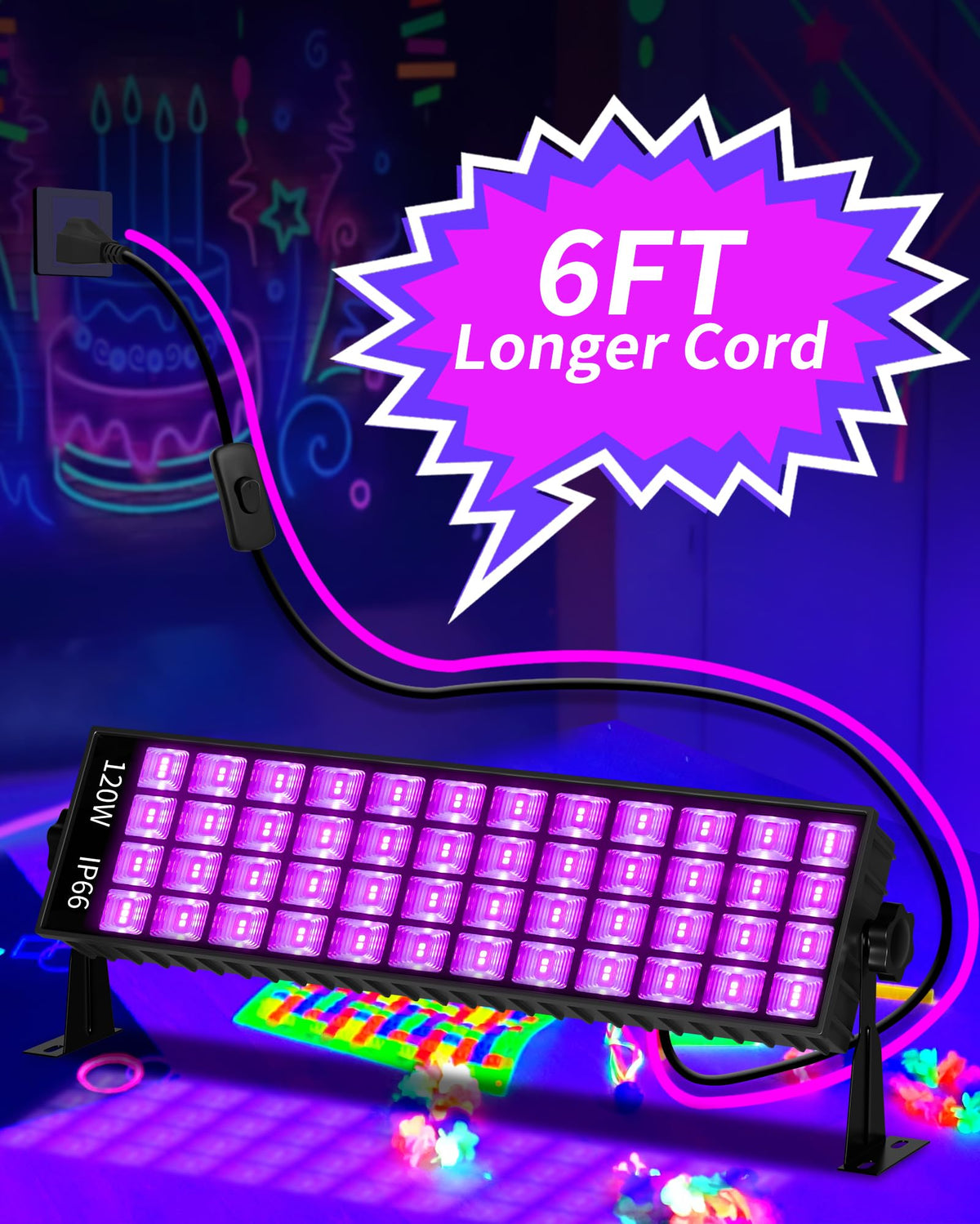 Q: How long is the power cord for the black light bar?A: The power cord for the ISUERFY 120W LED Black Light Bar is six feet long, allowing for flexible placement options.
