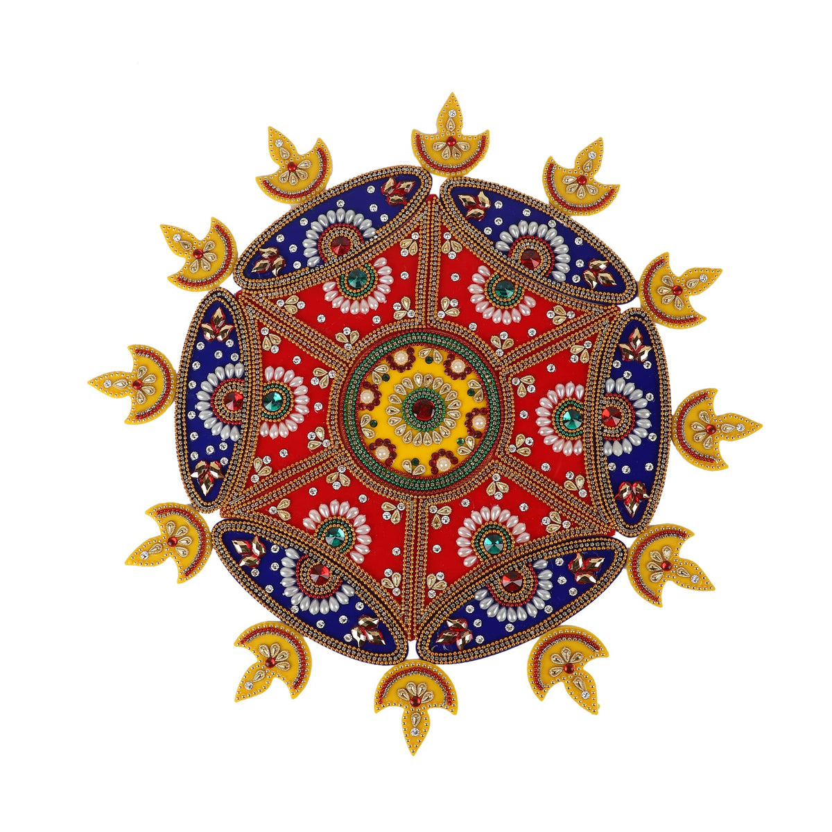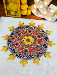 Add a charming look to your home entrance by installing Itiha 12 Diya acrylic Ready made Floor Rangoli that gives an ethic touch to your home. It measures 15 inches in length and breadth. Ideal for indoor as well as outdoor decor. Made on an acrylic base with beads and stones studded on it. Ideal to gift your loved ones on housewarming, Diwali Gift, festivals, return gifts etc