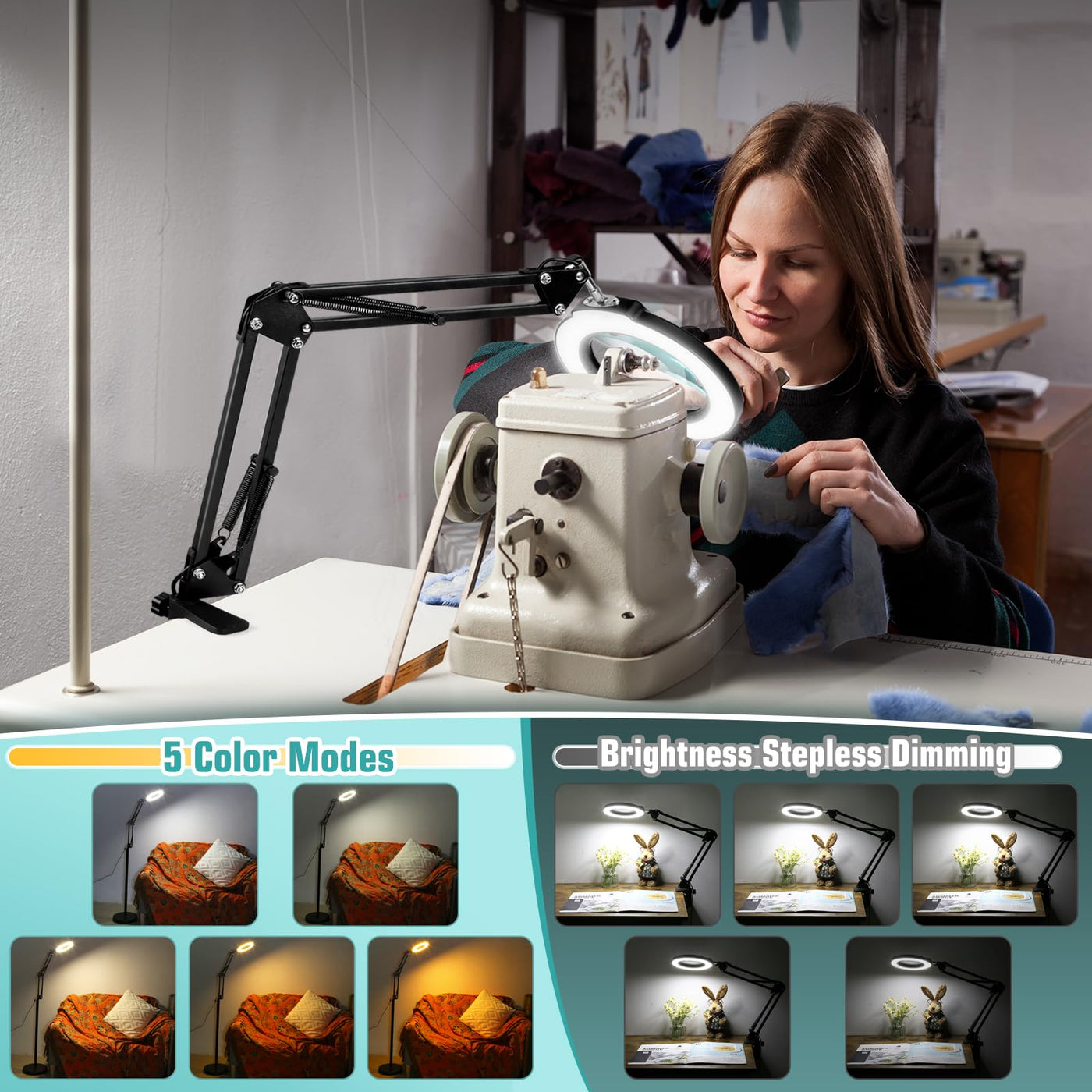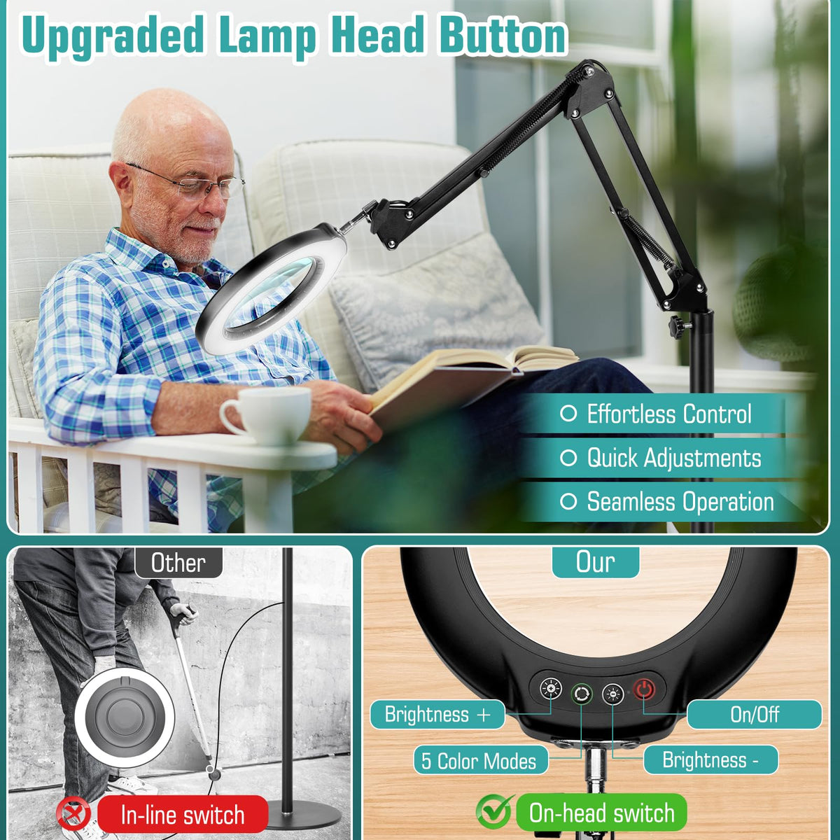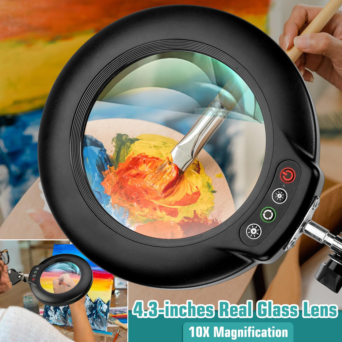 10X Magnification: Premium HD optical glass for clear, distortion-free viewing. Convenient Controls: Easy-to-reach buttons on the lamp head for quick adjustments. Customizable Lighting: 5 color modes and stepless dimming from 5% to 100%. Versatile Design: Functions as a floor lamp or clamp desk lamp with adjustable height. Quality Assurance: 36-month warranty and responsive customer service for peace of mind.