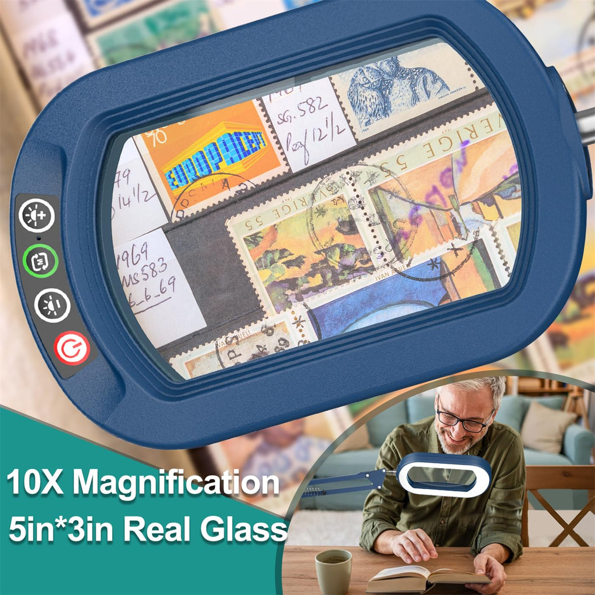 Q: What are the dimensions of the magnifying glass lens?A: The rectangular glass lens measures five inches by three inches, providing a large viewing area for various tasks.