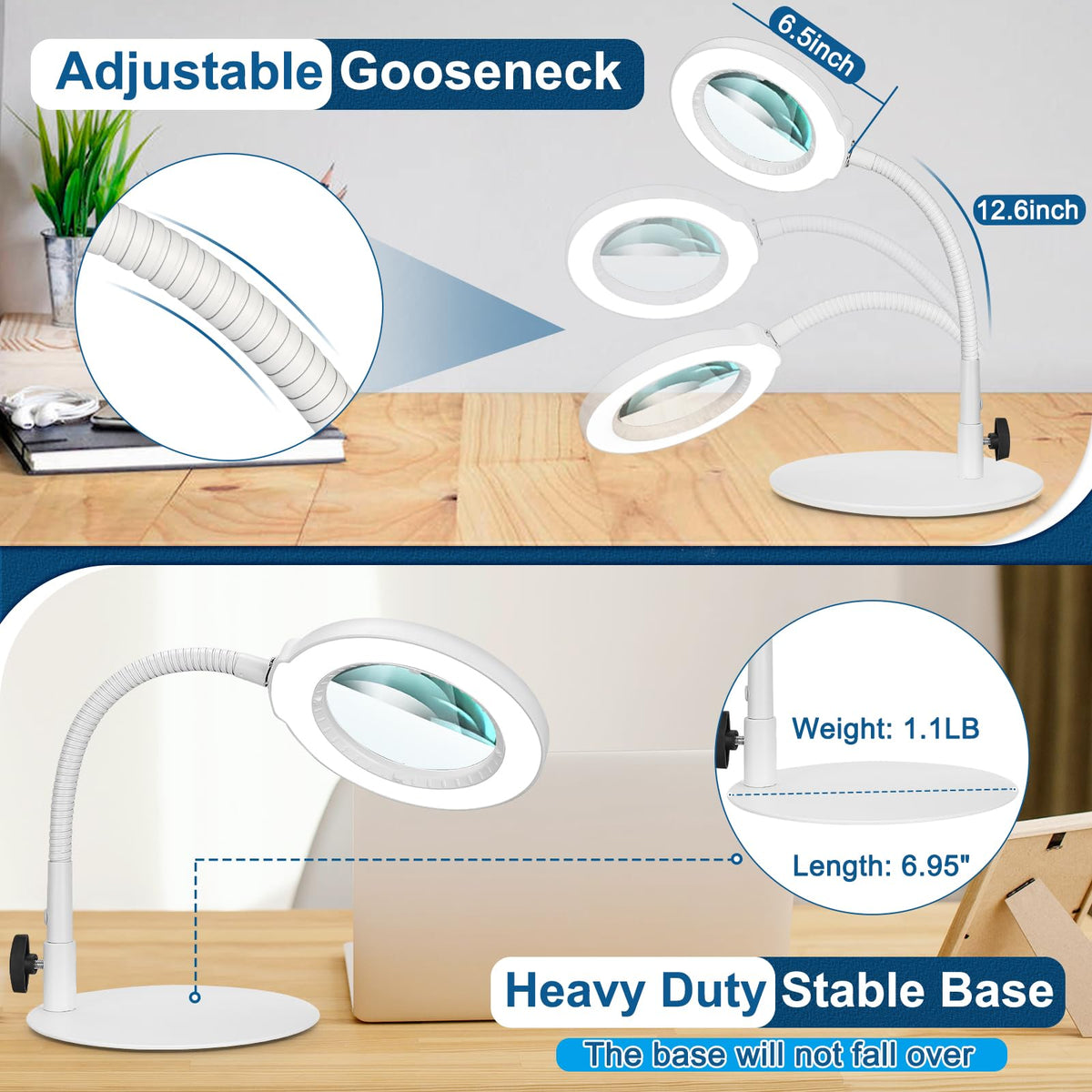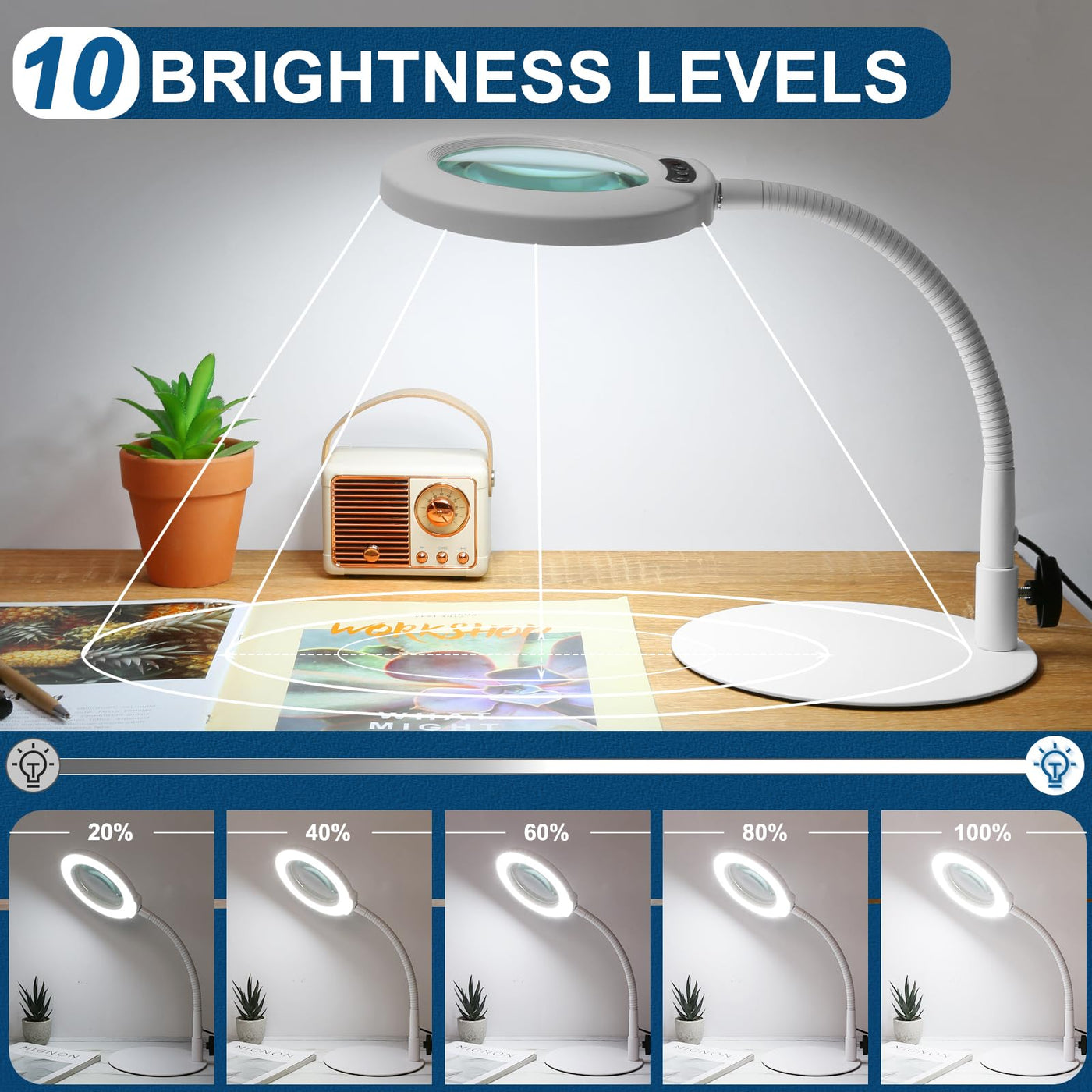 Ivmaie 10X Magnifying Glass With Light, Flexible Gooseneck Lighted Magnifier With Stand, 5 Color Modes Dimmable Led Desk Lamp Ha