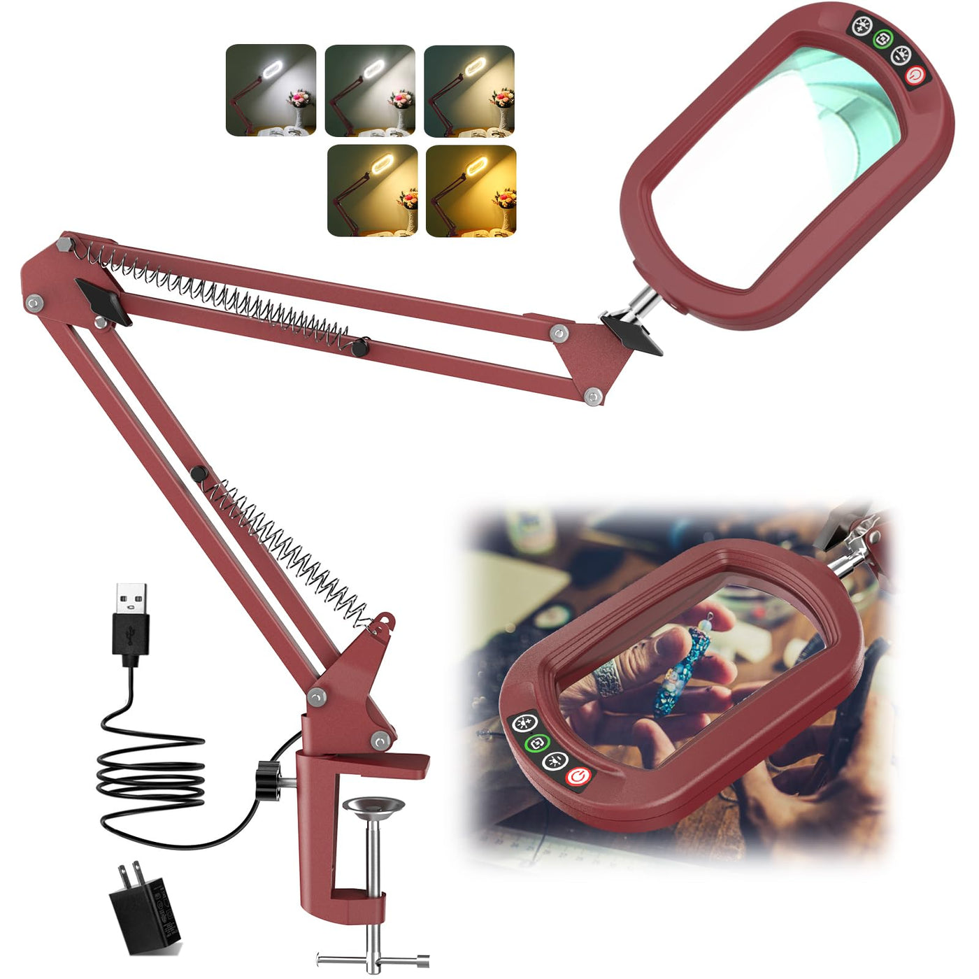 IVMAIE 10X Magnifying Glass with Light, Stepless Dimmable, LED Clamp Desk Lamp, Red, Model JZ602