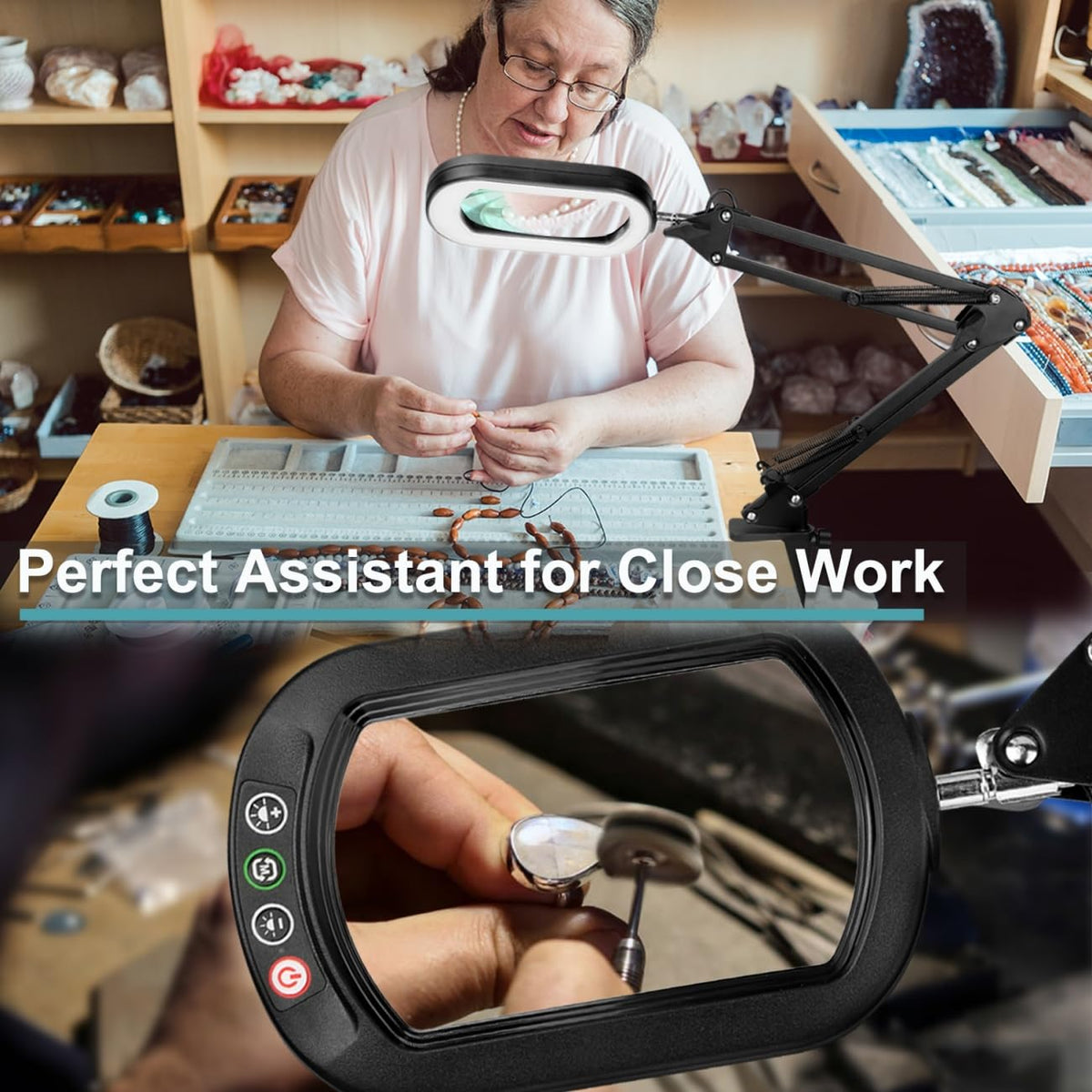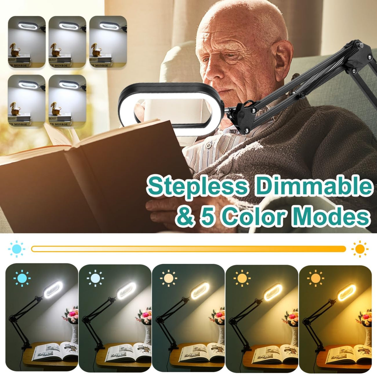 Convenient Head Button Control: Placing The Controls Directly On The Head Allows You To Easily Adjust The Light With A Quick Touch, No Fumbling With Switches. 5 Color Modes & Stepless Dimming: Easily Customize The Brightness From 10% To 100% And Select The Ideal Light Source For Your Environment With Just A Few Taps. Memory Function: The Lamp Remembers Your Previous Brightness And Light Color Settings, So There'S No Need To Readjust Every Time You Turn It On. Desk Magnifier With Adjustable Swing Arm: Crafted From High-Quality Metal, The Swing Arm Features 3 Knobs And 4 Springs, Providing Excellent Stability. You Can Easily Position The Magnifying Glass And Light To Suit Your Working Needs, Freeing Up Both Hands. The Clamp Can Be Mounted On Any Flat Surface (Up To 2.1'' Thick), Such As A Desktop, Shelf, Or Workbench-No Tools Required. Specifications: Exterior Color: Black Magnification: 10X Rectangular Glass Lens: 5*3 Inch Color Temperature: 5 Color Modes Metal Clamp: Max 2.1 Inch Swing Arm: 2 * 8.9'' Metal Swivel Arm Package Included: 1 X Magnifying Lamp 1 X Metal Clamp 1 X Ac 5V/2A Adapter 1 X User Manual