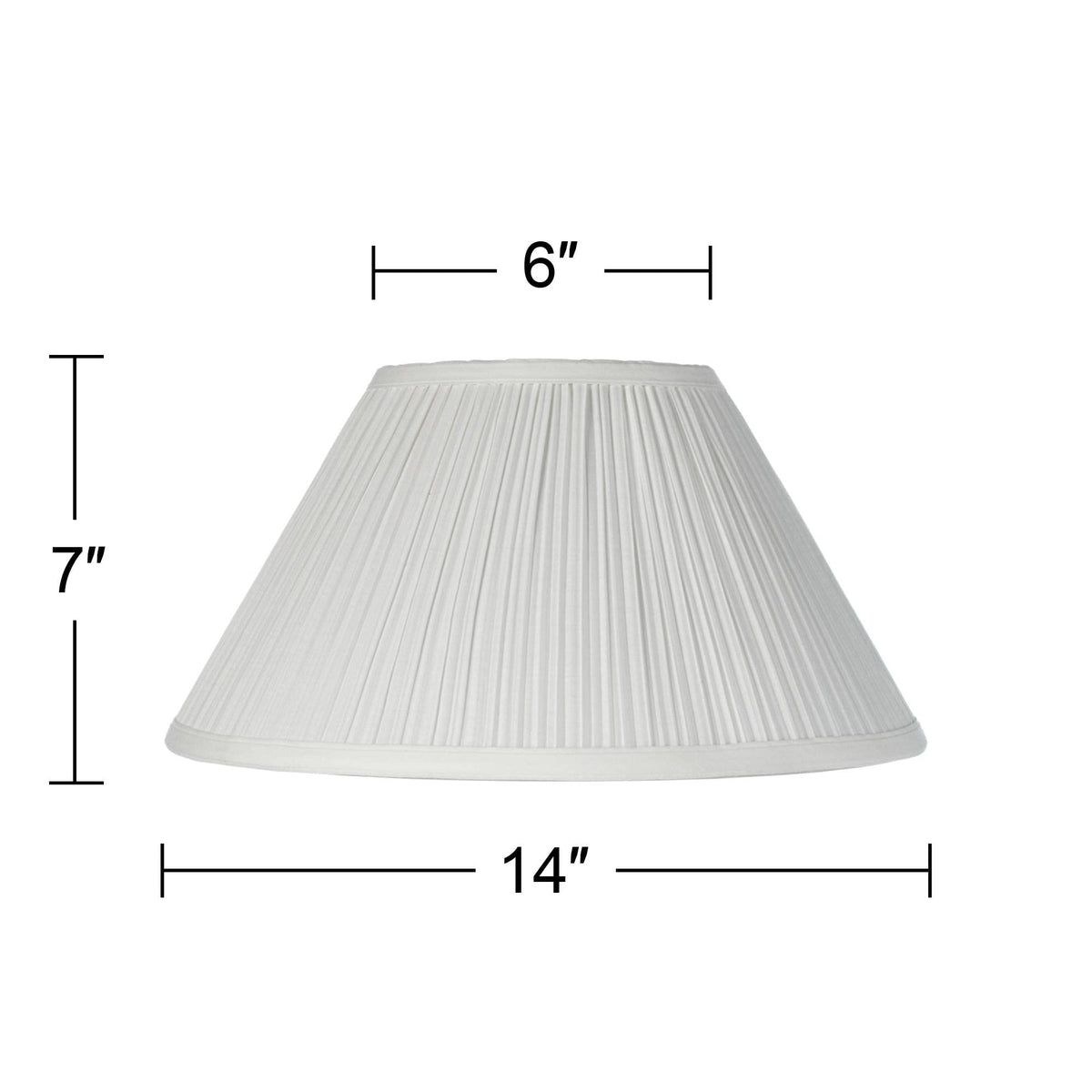Q: What are the dimensions of the Ivory Mushroom Pleated Medium Lamp Shade?A: The Ivory Mushroom Pleated Medium Lamp Shade measures 6 inches across the top, 14 inches across the bottom, 7 inches high, and has an 8-inch slant.