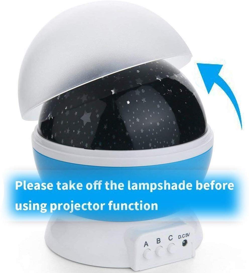 DescriptionIXWQ star master projector led moon romantic sky night lamp with 360 Degree Rotating Moon Star Projection with USB 9 Colour 4 LED Rotation Baby Sleep Lighting for Bedroom Kids Room Night BulbFeature:This night light can use the USB or battery power supply It can control rotation and make lamp luminous or colorful light. So beautifulBest Gift for your kidsThey will be a good sleep at nightfor decorating wedding, birthday, parties.Great for romantic night lamp and decoration light use.Best for home, bedroom, children rooms. Very romantic night, full of sincere gift.Power by 4 x AAA battery (Not Included) or USB cable. Energy power saving and environmental Friendly.Projection Lamp :You need take off the white lid cover to be projector to shine stars.Suitable for weddings, birthday parties, etc.,can create a romantic atmosphere in any occasion, can be used as a desk lamp in the bedroom.,P> Specifications:Voltage: 5V.Switch Type: 3 Push-Button.Light Source: 4 LED Bulbs .Color: Sky Blue, Pink, PurpleProduct Size: 13cm x 13cm x 14.5cm.Button Function Introduction :A Mode: Warm white light on/off switchB Mode: Lighting effect toggle (press B repeatedly until it switches off)C Mode: Rotation on/off switch.