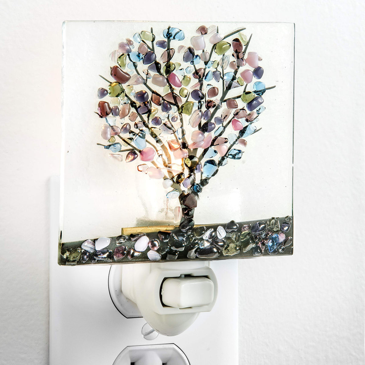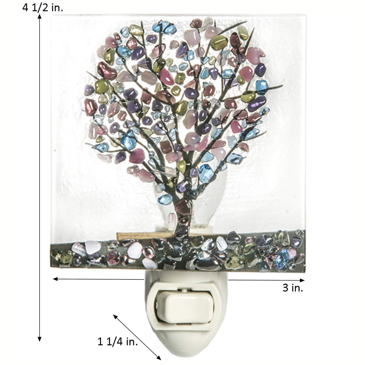 Bring a little outdoor look into your bathroom, bedroom, or kitchen with this decorative tree night light. Or use as an accent light in dark corners or hallways and enjoy the fun colors. Chips of stained glass are meticulously arranged onto the translucent clear glass and fired in a kiln permanently bonding the pieces and softening the edges. (Note the bulb of this night light is visible through the clear glass background.) This wall plug in night light fits sockets as shown in our photo. Wall plug in night light complete with base and clear bulb. A great gift for a special someone or, add to your own home decor today! See our full selection of glass decorative night lights, as well as nature-themed home accents in our Amazon store.
