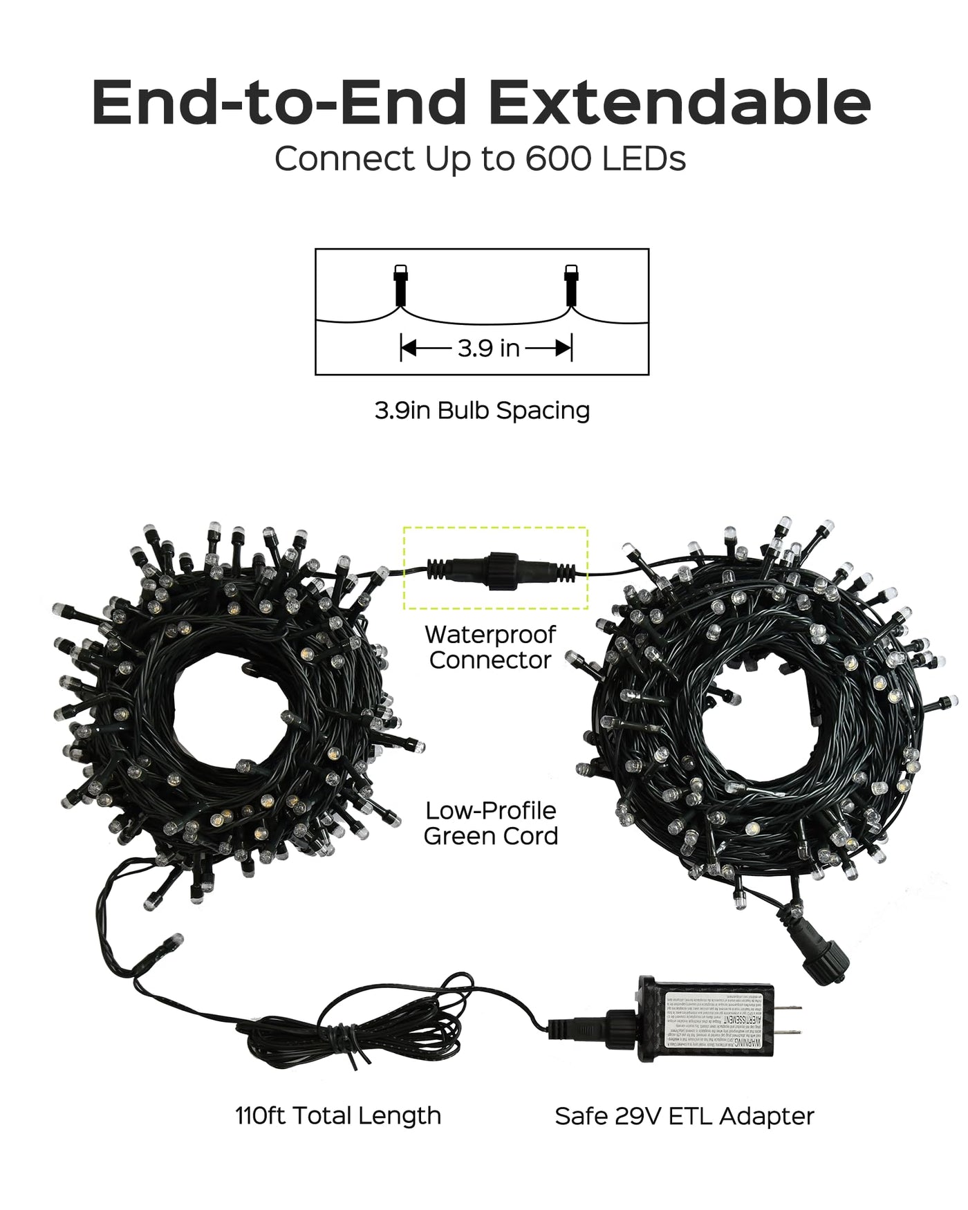 Q: Can these Christmas lights be connected together?A: Yes, these lights can be connected end-to-end, allowing you to combine multiple strings for larger displays. You can connect up to 600 LEDs, providing flexibility in decorating wider areas.