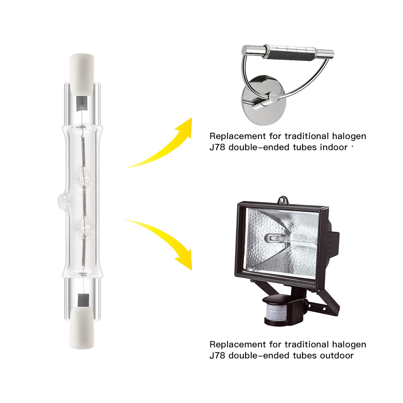 About Our Brand Jaenmsa We are a company specializing in manufacturing and selling bulbs and lamps. Founded in 1997, our factory has experienced a lot of difficulties, but they did not make us fall but made us more professional and experienced. Our R&D team has decades of lighting work experience, using only high-quality materials to bring better lighting experience to our global buyers. FEATURES LIGHT APPEARANCE: The warm white light adds cozy feeling, and sets the mood in your room. ENERGY EFFICIENCY: Halogen bulb Lowers down your operation cost by more than 30% lasts longer than a traditional incandescent light bulb. DIMMABLE: This light bulb can provide anything between 10% and 100% of lighting output. Simply adjust the dim of the light fixture create the perfect atmosphere. SUITABLE FOR: Ideal to use for ceiling lights, table, desk, floor or lamps, recessed lights, show lights, closet lights, outdoor lights for home, office, restaurants, clubs, and stores. INSTALLATION PRECAUTION: Important to note that J type halogen lamps should not come into contact with bare skin because the oils on the skin may damage the bulb, use a glove when changing J halogen bulb. Specification: 150W 120V R7s Halogen Bulb ?Voltage: 120V ?Power: 150W ?Lumen: 6750lm ?Lamp Base: R7s ?Dimmable: Yes, 10% to 100% ?Beam Angle: 360 ?Lifespan: 300 Hours ?Color Temperature:Warm White(2700K) Package included: 5 x R7s 78mm halogen bulbs