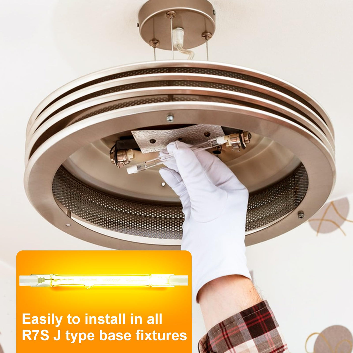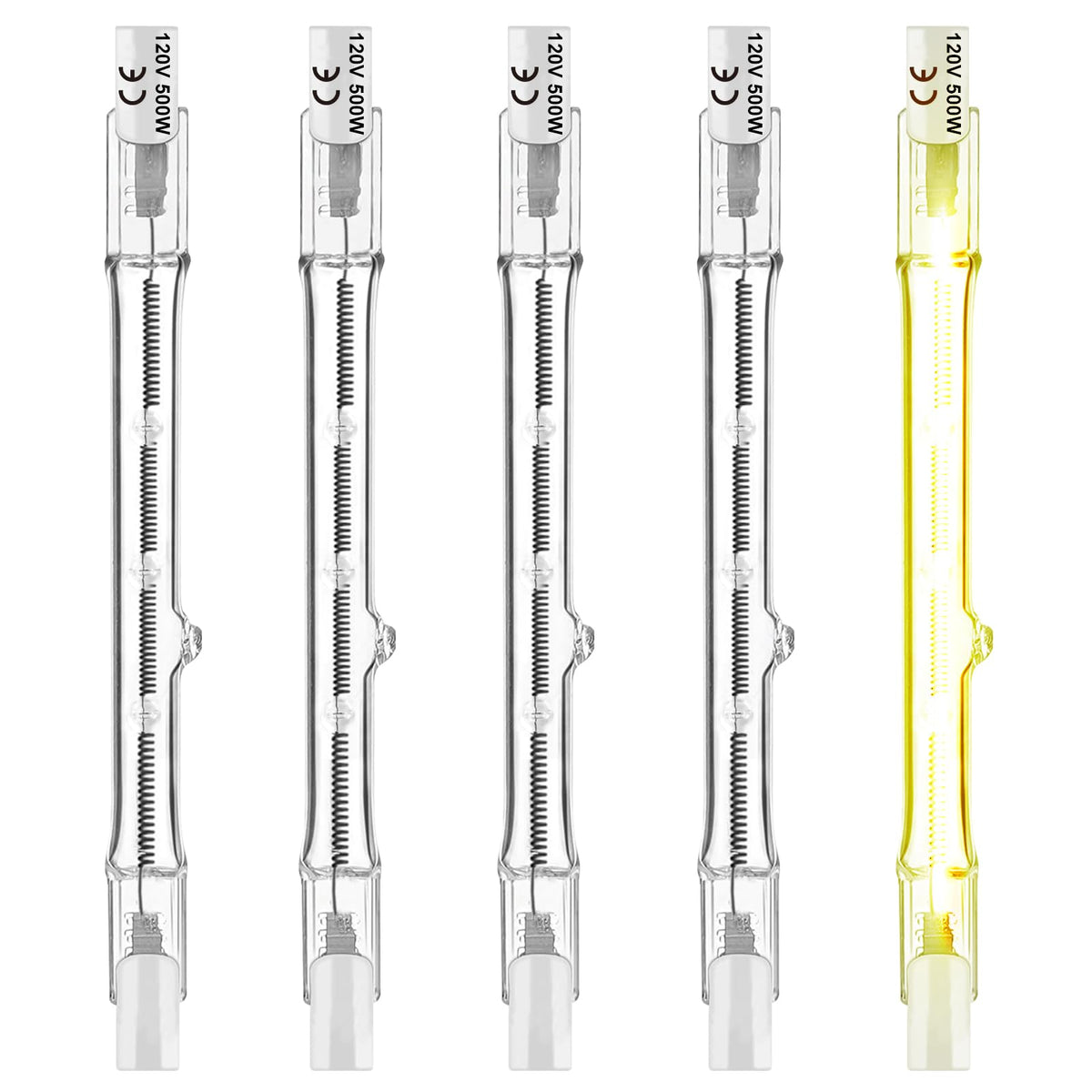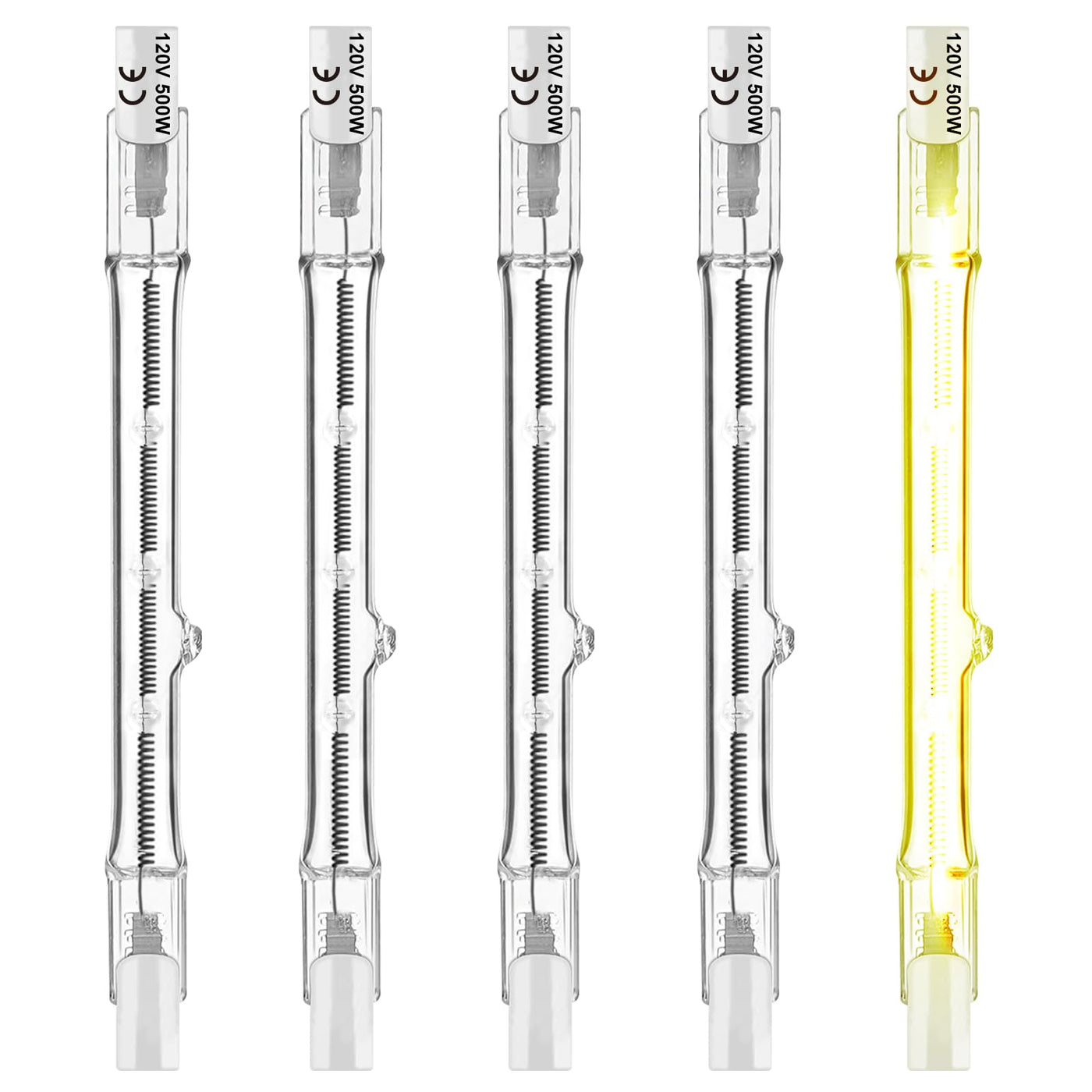 About Our Brand Jaenmsa We are a company specializing in manufacturing and selling bulbs and lamps. Founded in 1997, our factory has experienced a lot of difficulties, but they did not make us fall but made us more professional and experienced. Our R&D team has decades of lighting work experience, using only high-quality materials to bring better lighting experience to our global buyers. FEATURES LIGHT APPEARANCE: The warm white light adds cozy feeling, and sets the mood in your room. ENERGY EFFICIENCY: Halogen bulb Lowers down your operation cost by more than 30% lasts longer than a traditional incandescent light bulb. DIMMABLE: This light bulb can provide anything between 10% and 100% of lighting output. Simply adjust the dim of the light fixture create the perfect atmosphere. SUITABLE FOR: Ideal to use for ceiling lights, table, desk, floor or lamps, recessed lights, show lights, closet lights, outdoor lights for home, office, restaurants, clubs, and stores. INSTALLATION PRECAUTION: Important to note that J type halogen lamps should not come into contact with bare skin because the oils on the skin may damage the bulb, use a glove when changing J halogen bulb. Specification: 500W 120V R7s Halogen Bulb ?Voltage: 120V ?Power: 500W ?Lumen: 22500lm ?Lamp Base: R7s ?Dimmable: Yes, 10% to 100% ?Beam Angle: 360 ?Lifespan: 3000 Hours ?Color Temperature:Warm White(2700K) Package included: 5 x R7s 118mm halogen bulbs