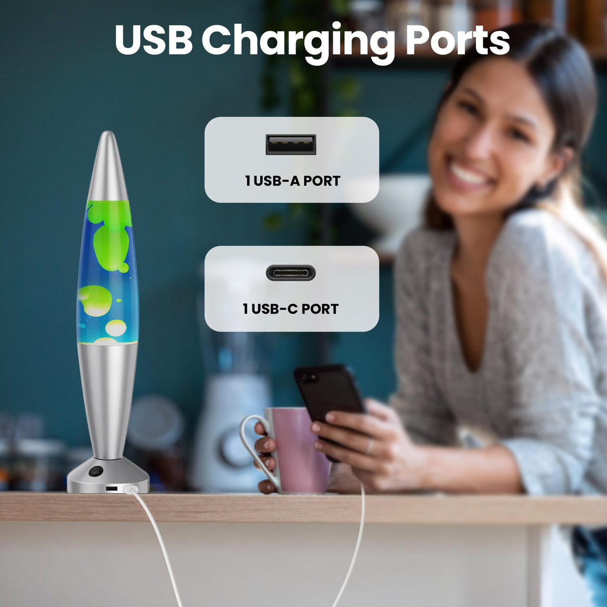 Crafted with well-made aluminum, the Jambo Liquid Motion Lamp features a striking silver base that complements its vibrant blue liquid and yellow wax. As the lamp operates, the wax heats up, creating a captivating motion of rising and falling shapes that mesmerizes viewers. This lamp is not only a decorative piece but also serves as a calming element for mindfulness and relaxation. The inclusion of USB and USB-C charging ports ensures that your devices remain powered while you enjoy the soothing effects of the lamp.