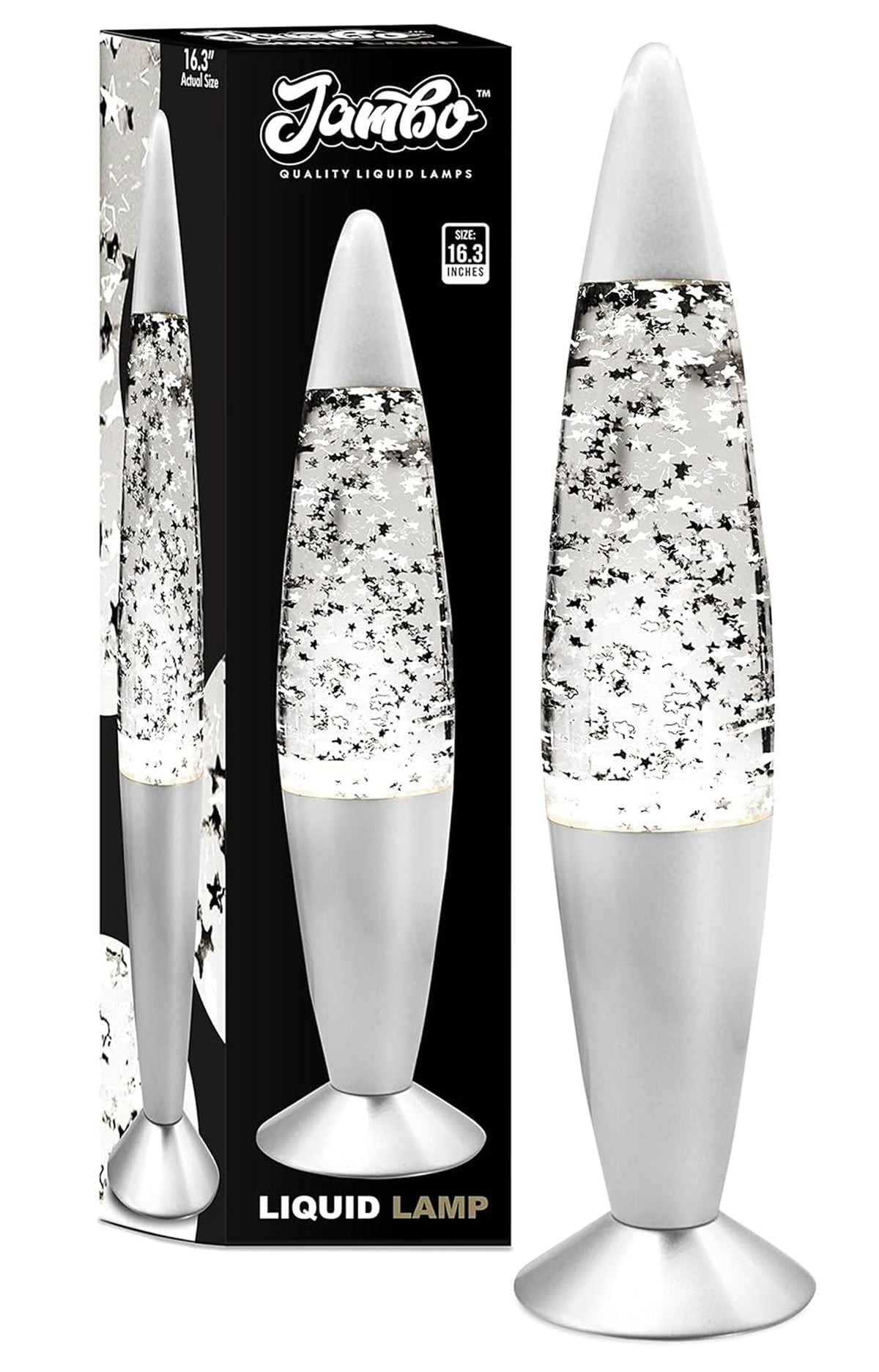 Q: How does the Jambo Glitter Lamp work?A: The Jambo Glitter Lamp uses heat to warm the liquid inside, causing the glitter to rise and fall, creating a mesmerizing visual effect.