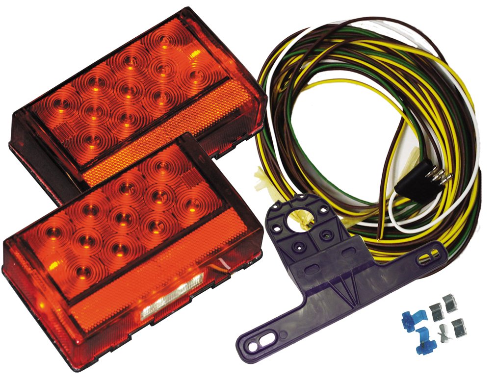 LED Lighting Kit for Over 80" Wide Boat Trailers. 6-1/4" x 3-3/4" size submersible tail lights have marine grade tinned wire, triple sealed electronics and 8" pre-attached leads for use on regular and marine trailers. Curbside (right) lamp has 13 Diodes. Streetside (left) light has 17 diodes, including license lamp diodes. Fits Karavan, ShoreLand'r, Continental, Magic Tilt and similar Dry Launch Style lamp applications with 2-Bolt industry standard mounting for easy replacement or upgrade. Included lighting meets all DOT/SAE standards for 7 & 8 function rear lighting. Wishbone wire harness has 25' hot leads to run down both sides of the trailer and one 30" ground wire with ring terminal for frame grounding.