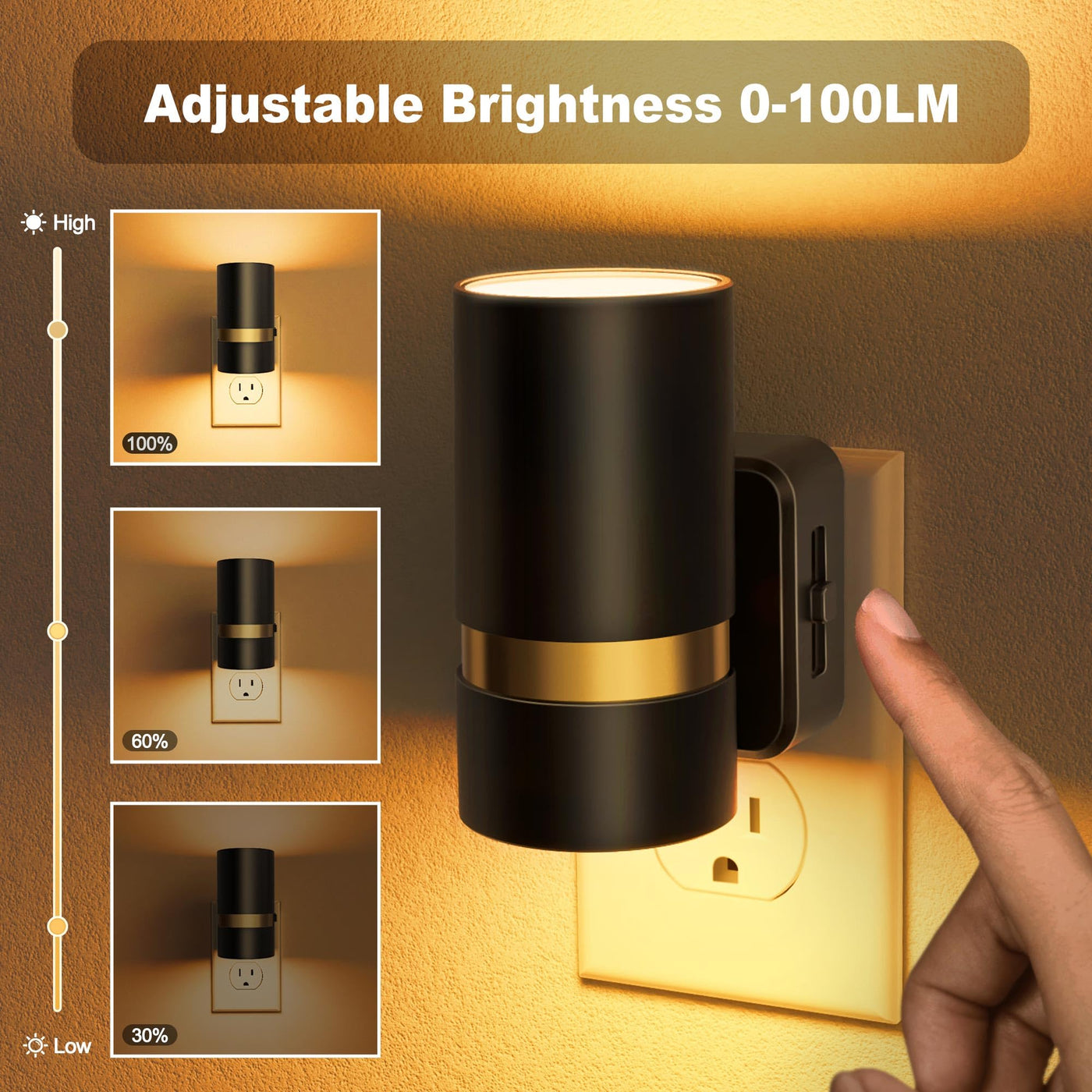 Stylish Design Night Light: Featuring a sleek black and gold finish, this modern night light effortlessly blends with a variety of home decor styles, adding a touch of sophistication to any space. | Automatic Light Sensor Nightlight: Built with a highly responsive dusk-to-dawn sensor, it automatically adjusts to the surrounding light, turning on at dusk and off at dawn for hassle-free, energy-efficient operation. | 0-100LM Adjustable Brightness: Offers customizable brightness levels from 0 to 100 lumens, allowing you to set the perfect amount of light, whether for a subtle nightlight or brighter illumination. | Amber Warm and Soothing Glow: Emits a soft amber light that