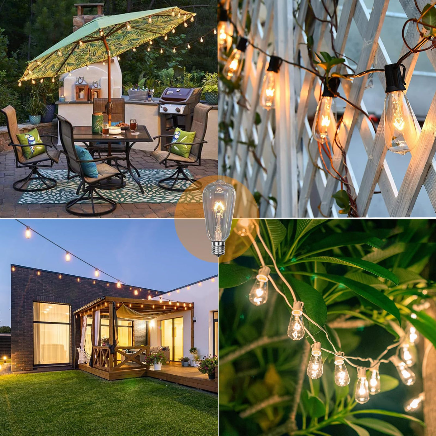 Our 7W light bulb selection is perfect for thomas edison light bulb enthusiasts who appreciate the vintage aesthetics. Ideal for decorative outdoor bulb in outdoor spaces, they are suitable as outoor string light replacement bulbs or light bulb string lights. Enjoy the gentle glow of edison that add a touch of elegance to your patio. For light bulb outdoor use, choose from this pack of 25 incandescent light bulb designed specifically for outdoor string light applications. Each outdoor light bulb offers a warm and inviting atmosphere, making it an excellent choice for creating an enchanting ambiance at night. Suitable for string light installations on patios or porches. Discover versatile outdoor light bulbs in this set of 25, suitable as replacement bulbs for outdoor string lights. Whether you're using them as cafe lights outdoor string lights or for other outdoor decorations, the E17 BULB base fits most fixtures effortlessly. Their 7 watt light bulb provide ample light without overwhelming, perfect for a cozy evening. Experience the timeless charm and warm ambiance of these incandescent edison bulbs, designed as replacement bulbs for string lights. Perfect for both indoor and outdoor patio string lights, this pack of 10 PK ST40 bulbs features an intermediate base E17 glass that fits most light fixtures. The classic design makes these bulbs ideal for recreating a vintage and inviting atmosphere in any setting. Specifications: Power: 120V 7W Each Bulb Bulb Base: E17 Bulb Material: Glass Waterproof Rating: IP65 Color Temperature: 2700K Lumen: 40 Lumen Each Bulb Lifespan: 1000 Hours