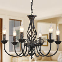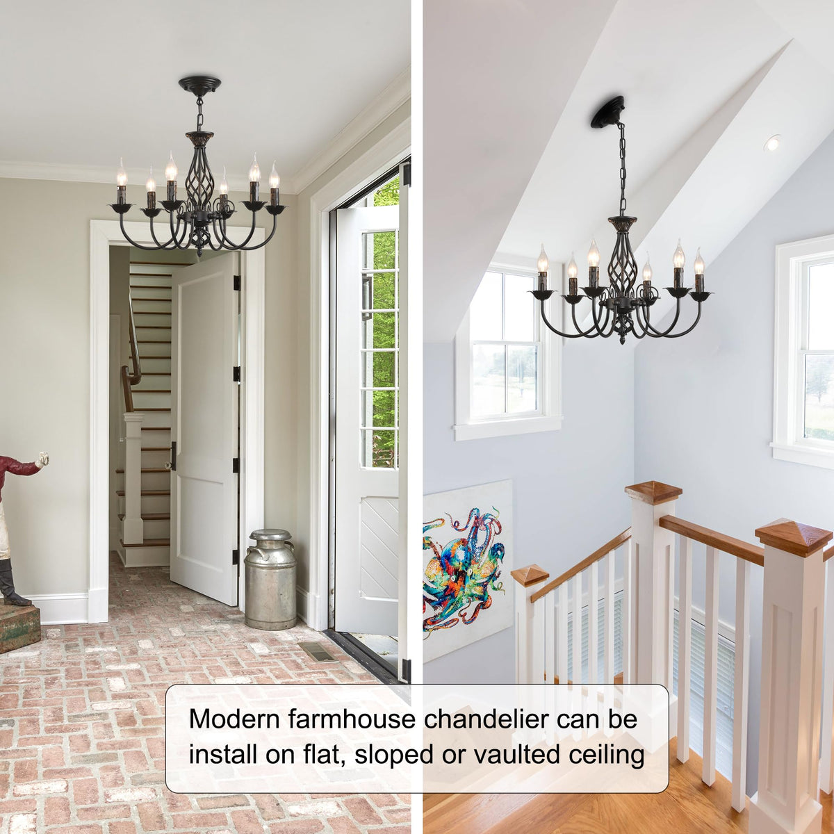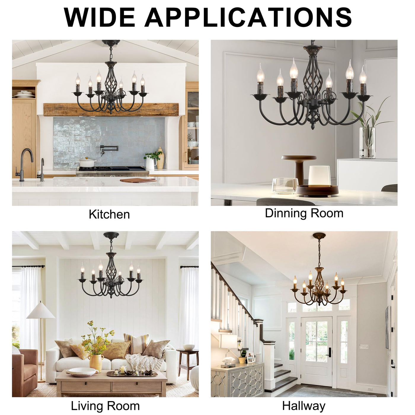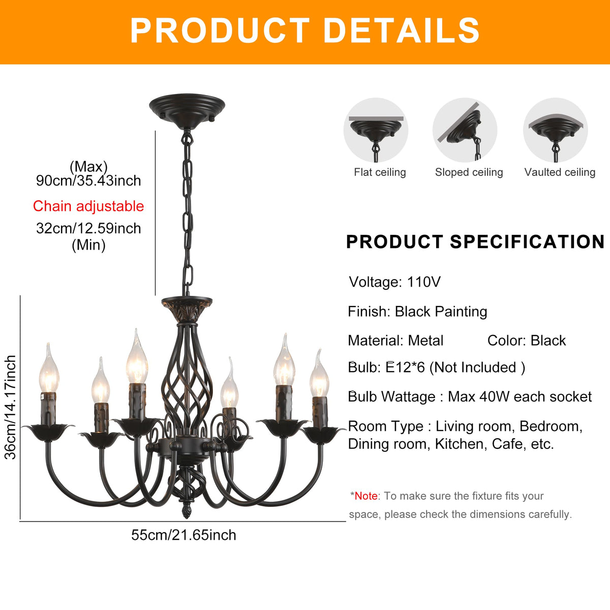 Specification:Product Name: 6-Light Vintage Black ChandelierColor: BlackMaterial: Iron, MetalNumber of bulbs: 6 (Bulbs are Not included)Type of bulbs : E12Bulb wattage: 40W eachVoltage: 110-220VConnection method: Hardwire connectionDimmable: Need to have both dimming bulbs and a dimmer switch (NOT Include)Scope: Living room, farmhouse, bedroom, foyer, restaurantSize:Round top cover: 4.72'' (12cm)Chain : 35.4'' (90cm) adjustableLight Fixture: Length 21.65'' x Width 21.65'' x Height 14.17'' (55 x 55 x 36cm)Feature:--This retro French country chandelier can satisfy your pursuit of retro style. You can choose warm white or cool white E12 bulbs, which will have different effects on the ceiling.--Chandeliers can be used indoors, in warehouses or in barns, but we do not recommend them for outdoor use.--The sling chain can be adjusted to suit all your lighting needs and the desired look to suit different lengths.--A simple chandelier with a beautiful oil-brushed black finish that can be hung on a sloping ceiling to meet your space needs.--When installing the lamp, disconnect the power supply and pay attention to safety. Turn off the power when cleaning the lamp or replacing the lamp.--All parts are supplied in the box, please follow the instructions.Package Included:1 x Chandelier(Bulbs NOT included)1 x Manual
