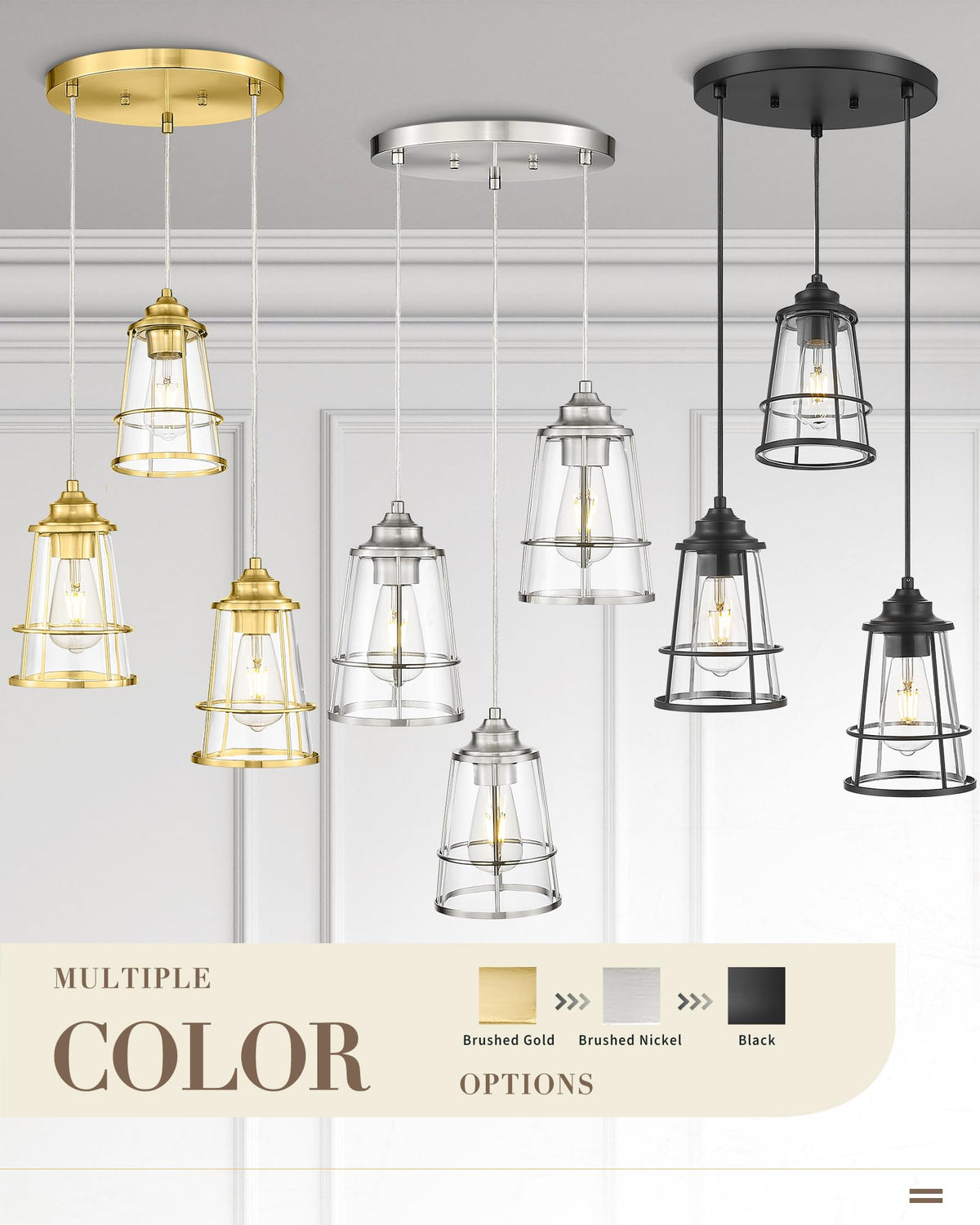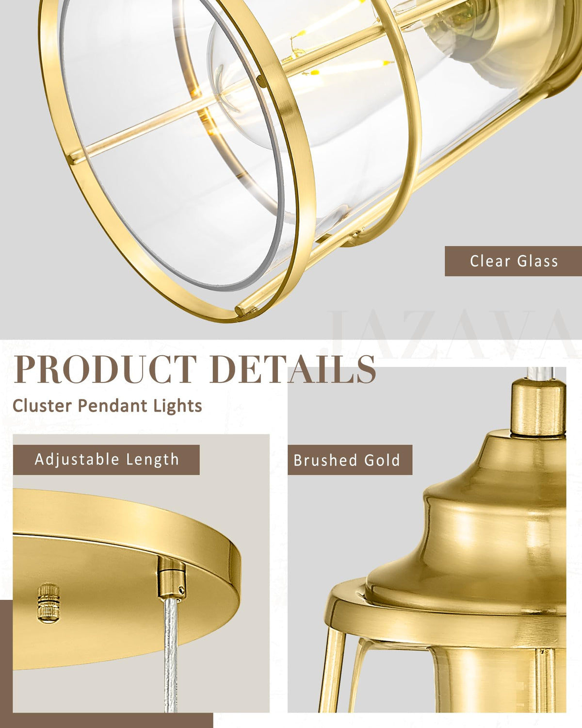 Descriptions: Energetic And Flush With Charm, The Collection Delivers A Masterful Blend Of Art And Architecture. Indulge In The Industrial-Inspired Aesthetic Of A Fascinating Concept That Shapes The Design Personality In A Mixed Motif Space. The Contemporary Attitude Is Softened With Simple Finishes In Brushed Gold, And A Heady Cone Shade Style Made From Clear Glass. Features: 1. Modern Design. Inspired By A Trumpet, This Kitchen Pendant Light Features Elegant Metal Lines And A Brushed Gold Finish That Beautifully Complements Transparent Glass, Making It A Perfect Blend Of Art And Functionality. 2. Wide Application. This Hanging Light Fixture Is Suitable For Various Settings, Including Dining Rooms, Bars, Kitchen Islands, Over Sinks, And Bedrooms, Providing Ample Illumination For The Space. 3. Bulb Required. The Light Pendant Requires 3 X E26 A19/St58 Led Edison Bulb, With A Maximum Wattage Of 60W (Bulb Not Included), And Allows For Customizable Lighting Effects With A Dimmable Bulb And Dimmer. Package Included: 1 X Cage Cluster Pendant Light 1 X Instruction Manual Some Installation Accessories