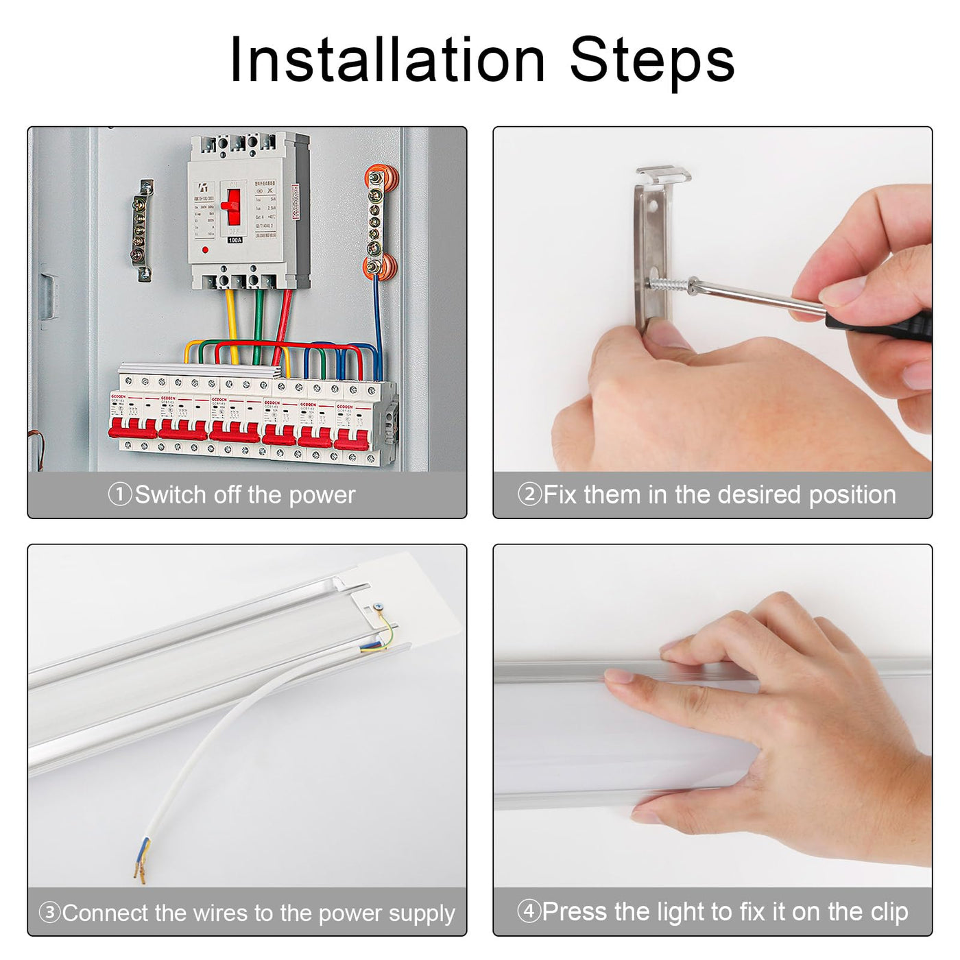 Q: What are the installation steps for the Jazoctig LED Batten?A: Installation involves cutting the power supply, fixing plastic buckles to the wall, wiring two lines to the external power lines, securing the light to the buckles, and finally turning on the power supply.