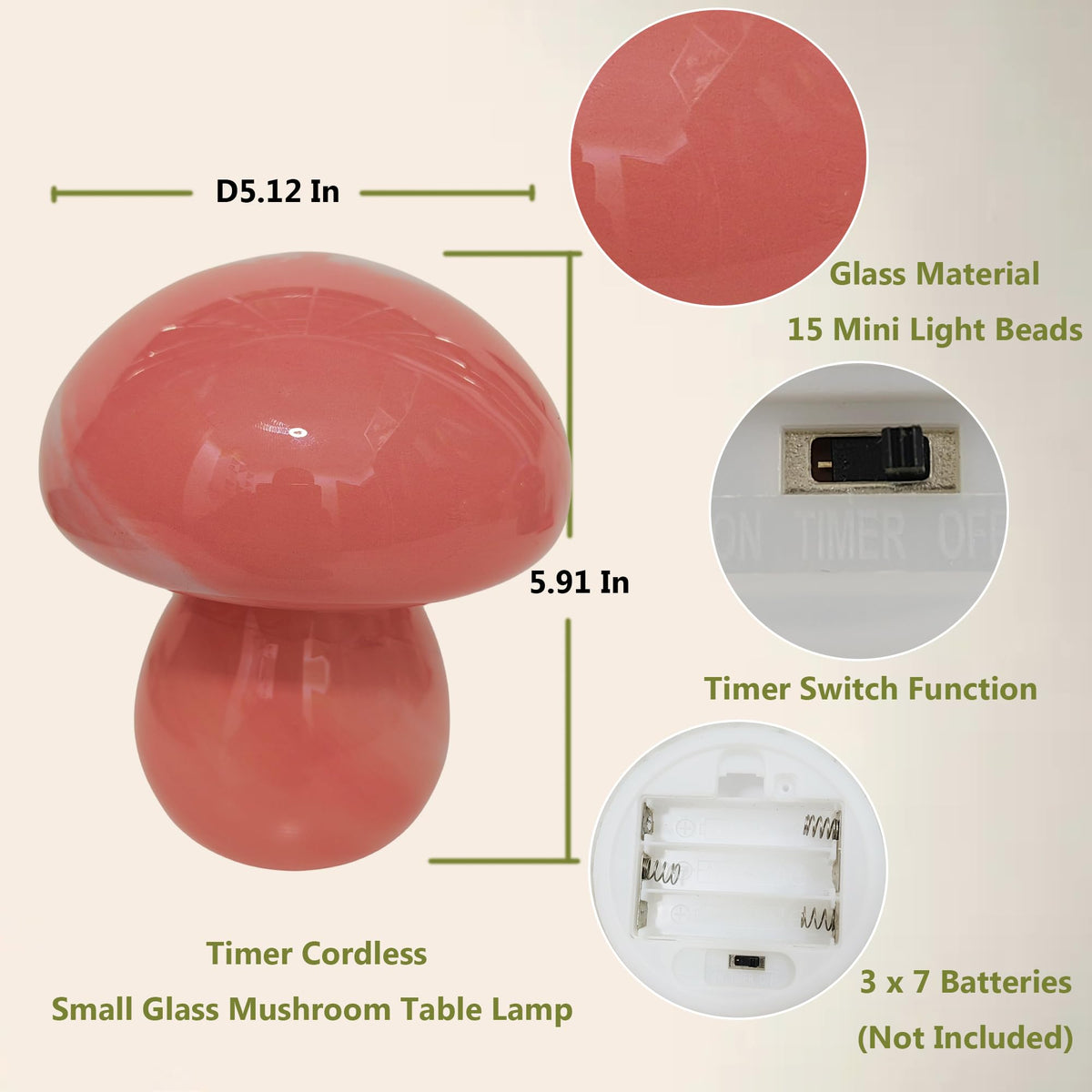 Introducing our enchanting Mini Mushroom Table Lamp - a whimsical addition to brighten up your space with its adorable design. This glass table lamp is not just a source of light but a charming decor piece. The unique desk lamp features a captivating mushroom shape that adds a touch of playfulness to any room. The glass lampshade, coated with advanced spray paint, enhances its visual appeal with vibrant and stunning colors. Meticulously designed, this glass nightlight table lamp is a testament to quality craftsmanship. One standout feature is its convenient timer switch, allowing you to personalize your lighting experience. Activate the automatic timer function, and the small glass table lamp will shine continuously for 6 hours before gracefully turning off. After 18 hours, it resumes, ensuring a consistent on/off cycle tailored to your daily routine. Powered by 3 AAA batteries (not included), this mini glass mushroom lamp offers the flexibility to place it anywhere without worrying about power outlets. The 15 warm white LED bulbs inside, equipped with LEA lamp heads, emit a cozy glow, creating a warm and inviting atmosphere. This mini night light table lamp product is not just a lighting solution; its a statement piece that adds charm and character to your space. The small lamp for nightstand glass lampshade and sleek spray paint finish showcase attention to detail and a commitment to delivering a product thats both exquisite and durable. Elevate your home decor with this versatile and whimsical Cute Glass Mushroom Table Lamp. Perfect for bedside tables, reading nooks, or any corner that needs a touch of magic.