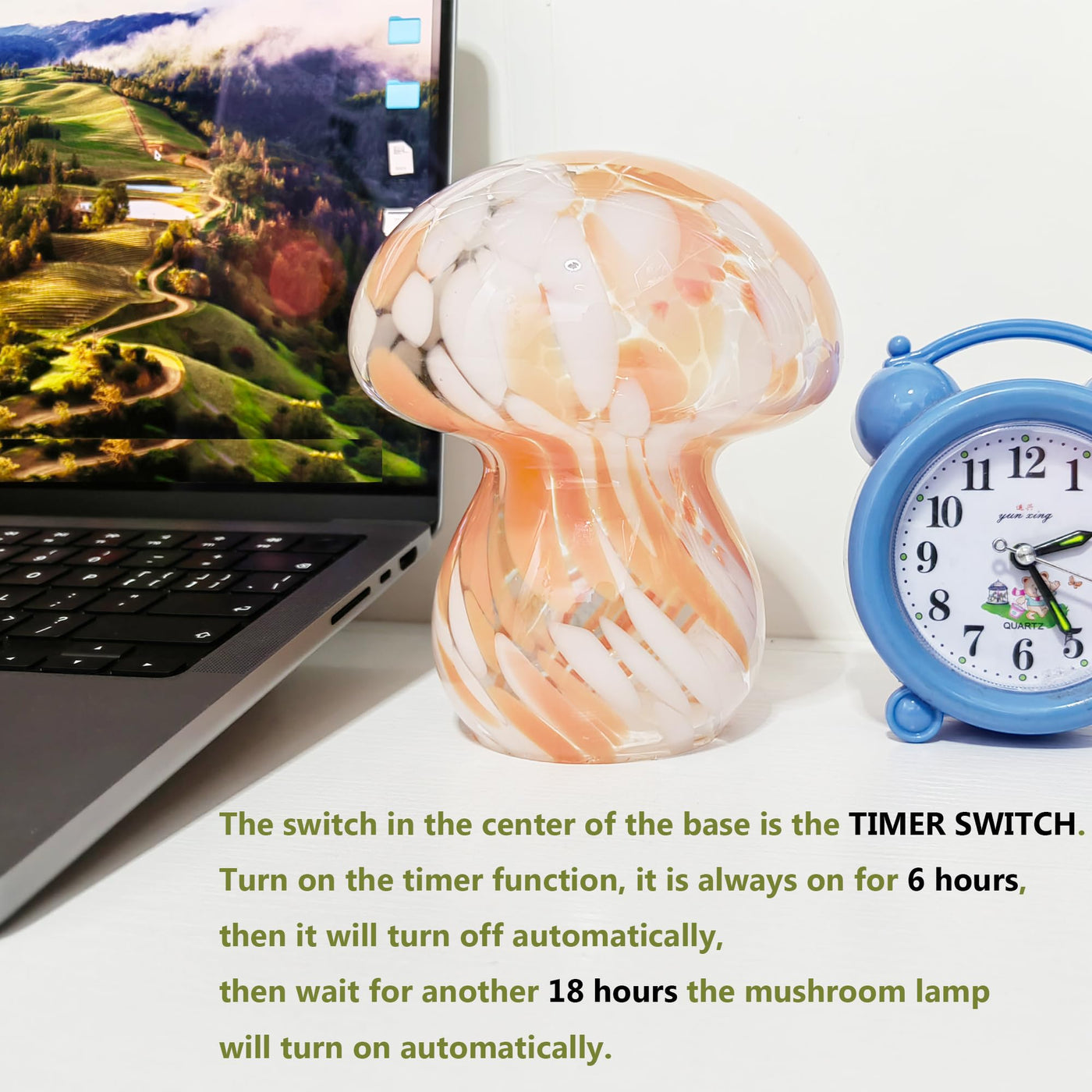 Q: How does the timer functionality work on this lamp?A: The built-in timer switch allows the mushroom lamp to illuminate for 6 hours continuously before automatically turning off. After 18 hours, it restarts, making it easy to set daily on and off cycles without manual intervention.