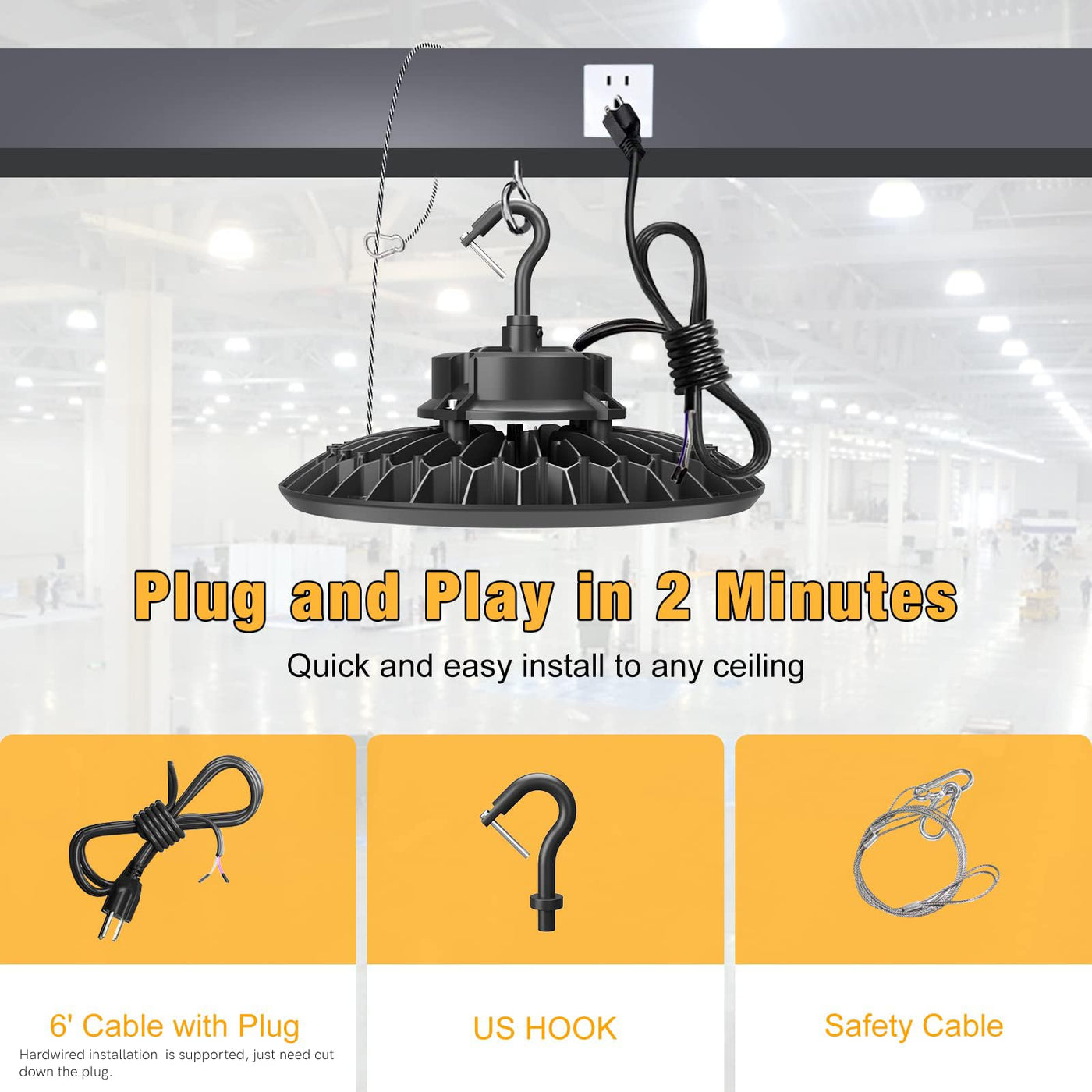 Q: How easy is it to install the JC-LGL LED UFO High Bay Light?A: The installation is hassle-free and can be completed in just 3 minutes. It comes with a 5FT power cord, standard American plug, safety rope, and portable hook.