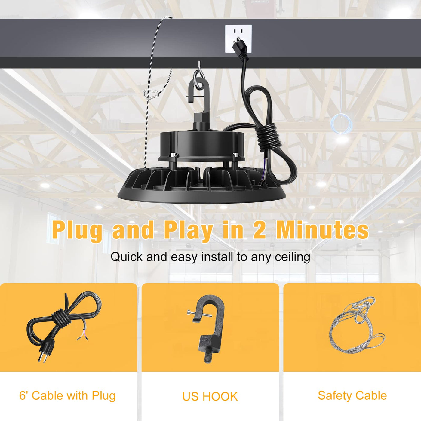 Q: What is included with the JC-LGL UFO LED High Bay Light for installation?A: The product comes with a 6-foot power cord, a standard American 3-prong plug, a safety rope for securing the light, and a portable hook for easy installation.