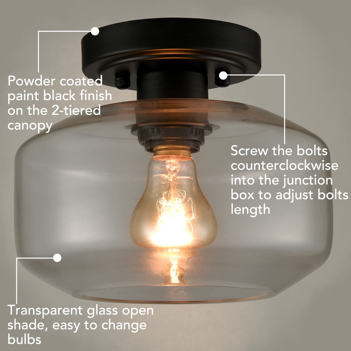 Crafted from durable materials, this ceiling light features a sleek black finish with a powder coat discomfort-reducingted surface, ensuring rust resistance and longevity. The open drum-shaped glass shade is hand-blown, making each fixture unique. This design allows easy access for changing light bulbs, promoting convenience and ease of maintenance. With a focus on functionality, the light is compatible with various bulb types, including LED, CFL, and incandescent, making it a versatile addition to your home.