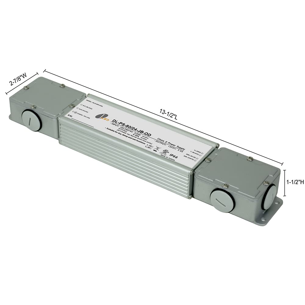 Q: What safety ratings does this power supply have?A: The Jesco Lighting DL-PS-80-24-JB-OD is UL1310 Class 2 and UL8750 listed, ensuring it meets high safety standards for electrical equipment, which provides peace of mind during use.