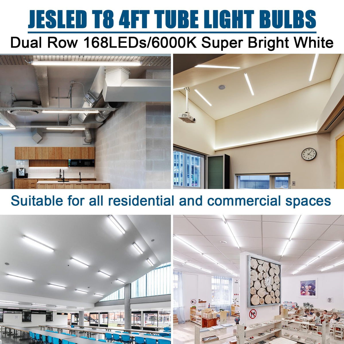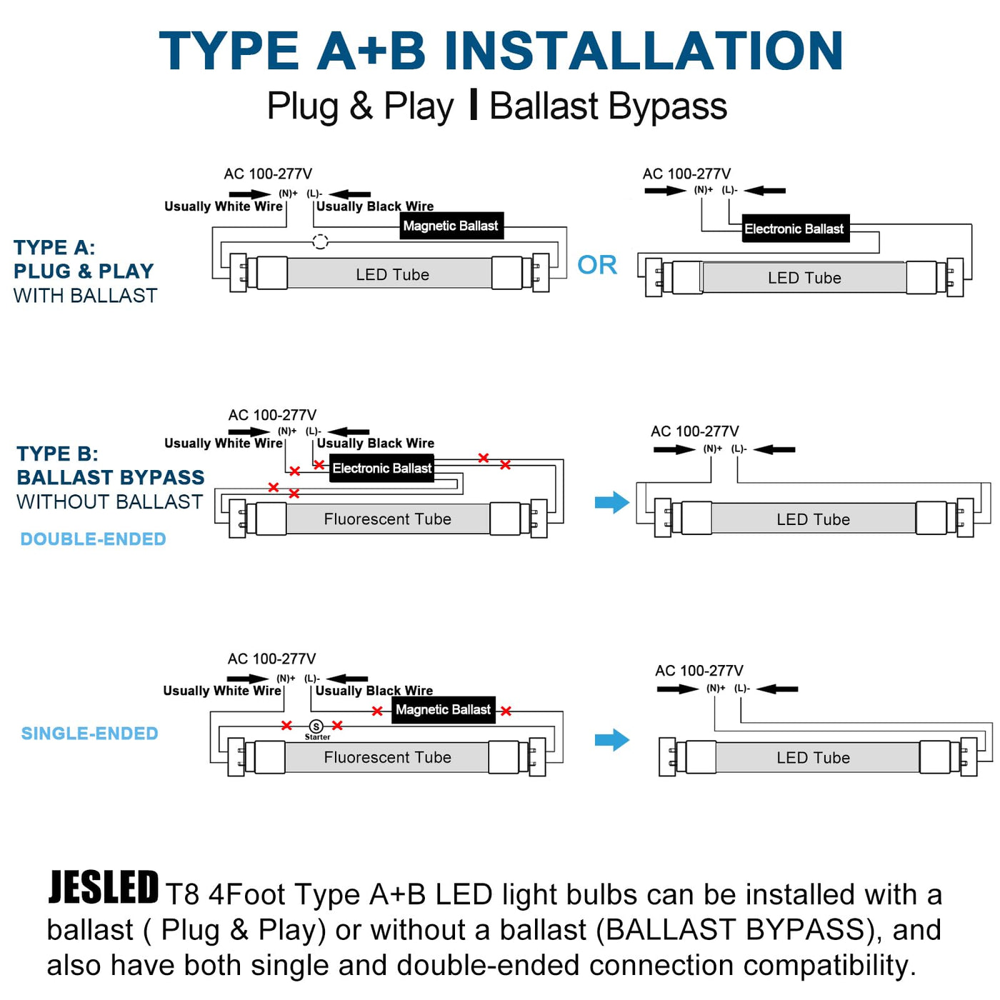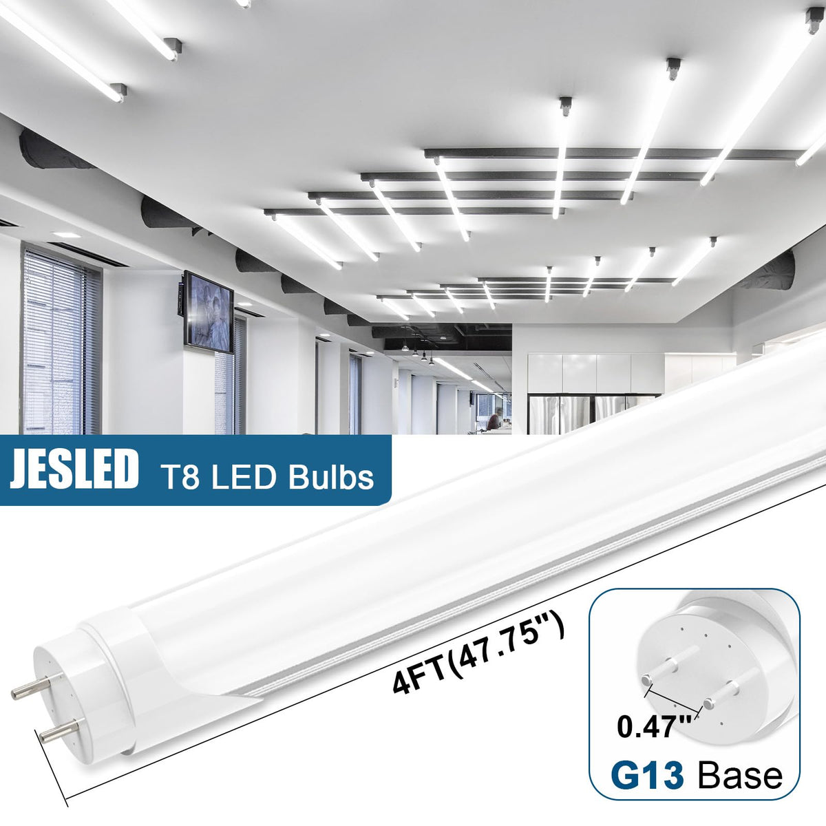 Jesled 4Ft Led T8 Type A+B Tube Lights, 24W(65W Equiv.), 3200Lm, 6000K, Single Or Double End Powered, Plug And Play Or Ballast B