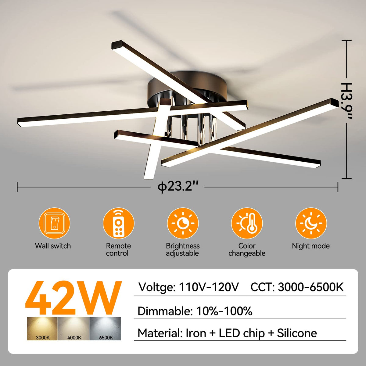 JFHTNFJ 42w Modern Sputnik Ceiling Light Fixture LED Dimmable with Remote Control Ceiling Lighting Black Flush Mount Chandelier