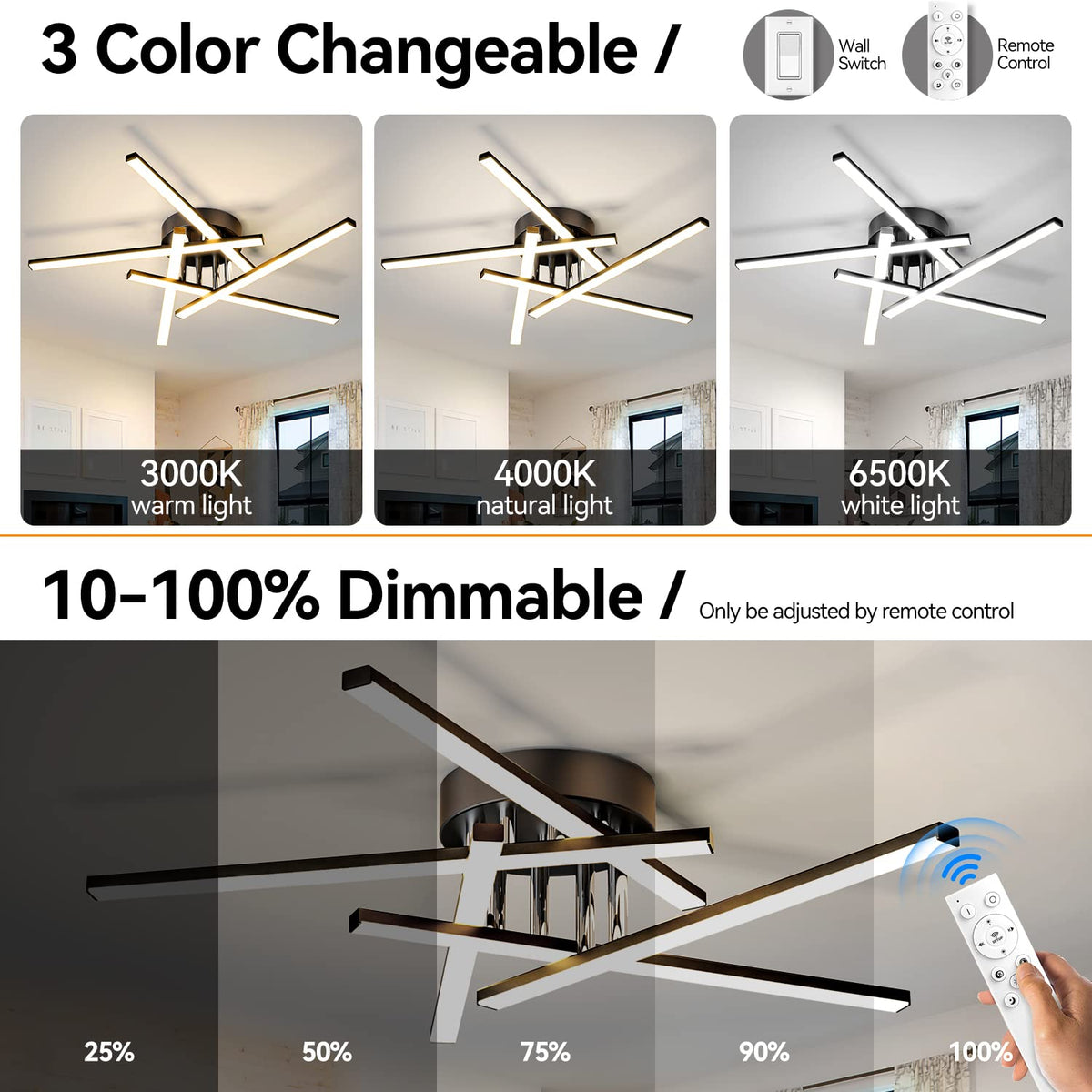 Modern Sputnik Ceiling Light Fixture LED Dimmable with Remote Control Ceiling Lighting Black Flush Mount Chandelier Ceiling Lamp for Bedroom Study Kitchen Living Room 3-Color