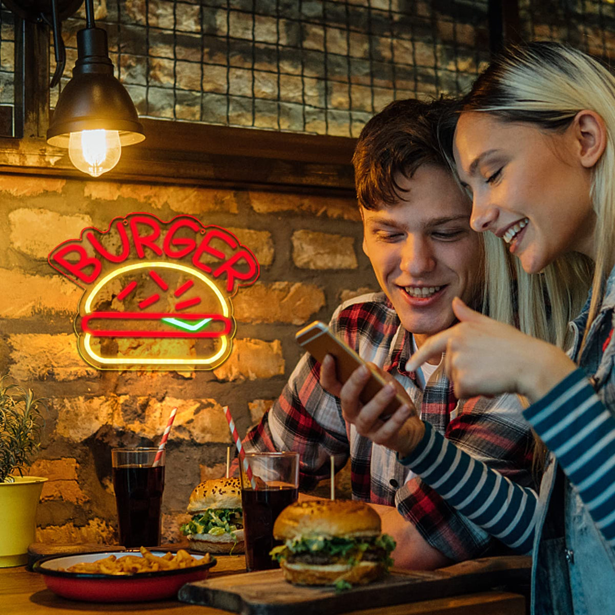 Jfllamp Burger Neon Signs For Wall Decor Neon Lights For Bedroom Led Business Signs Suitable For Hamburger Restaurant Office Man Cave Beer Bar Pub 5V Power Adapter, 14.1 * 10 Inch(Red+ Warm White)