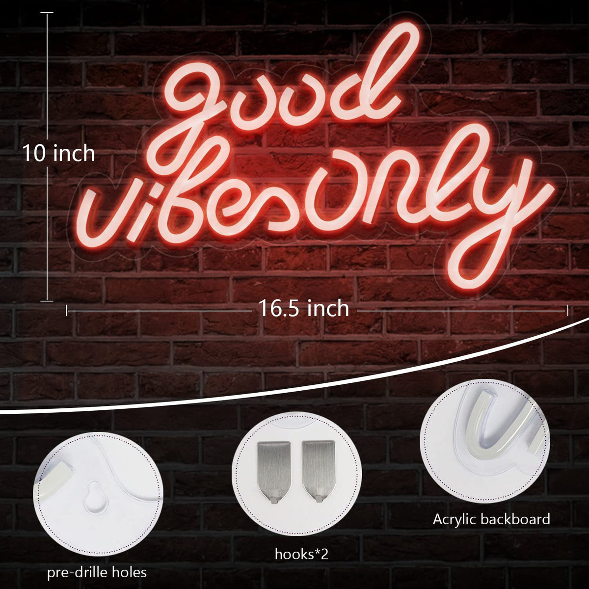 • Lights Shaped: Good Vibes Only • Lights Color: Red • Material: Plastic + LED light strip • Light Source: LED • Control Mode: Switch control • Product Size: L: 45cm/16.5" * H: 25cm/10" • Power Supply: 5V USB