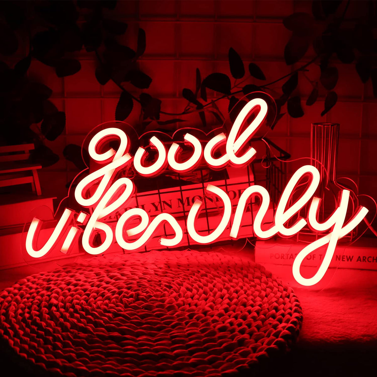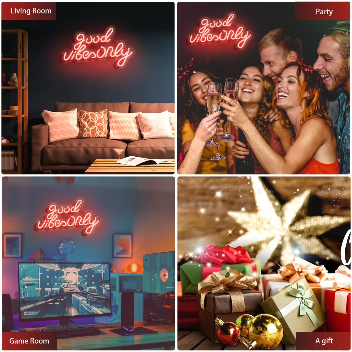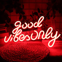 Transform your space with the captivating Good Vibes Only neon sign. This stunning LED light decor is ideal for creating a dreamy atmosphere in any room, including bedrooms, game rooms, living rooms, kids' rooms, and nurseries. A thoughtful gift choice for birthdays, Valentine's Day, and Christmas, this sign is perfect for families, lovers, girlfriends, boyfriends, and children alike.