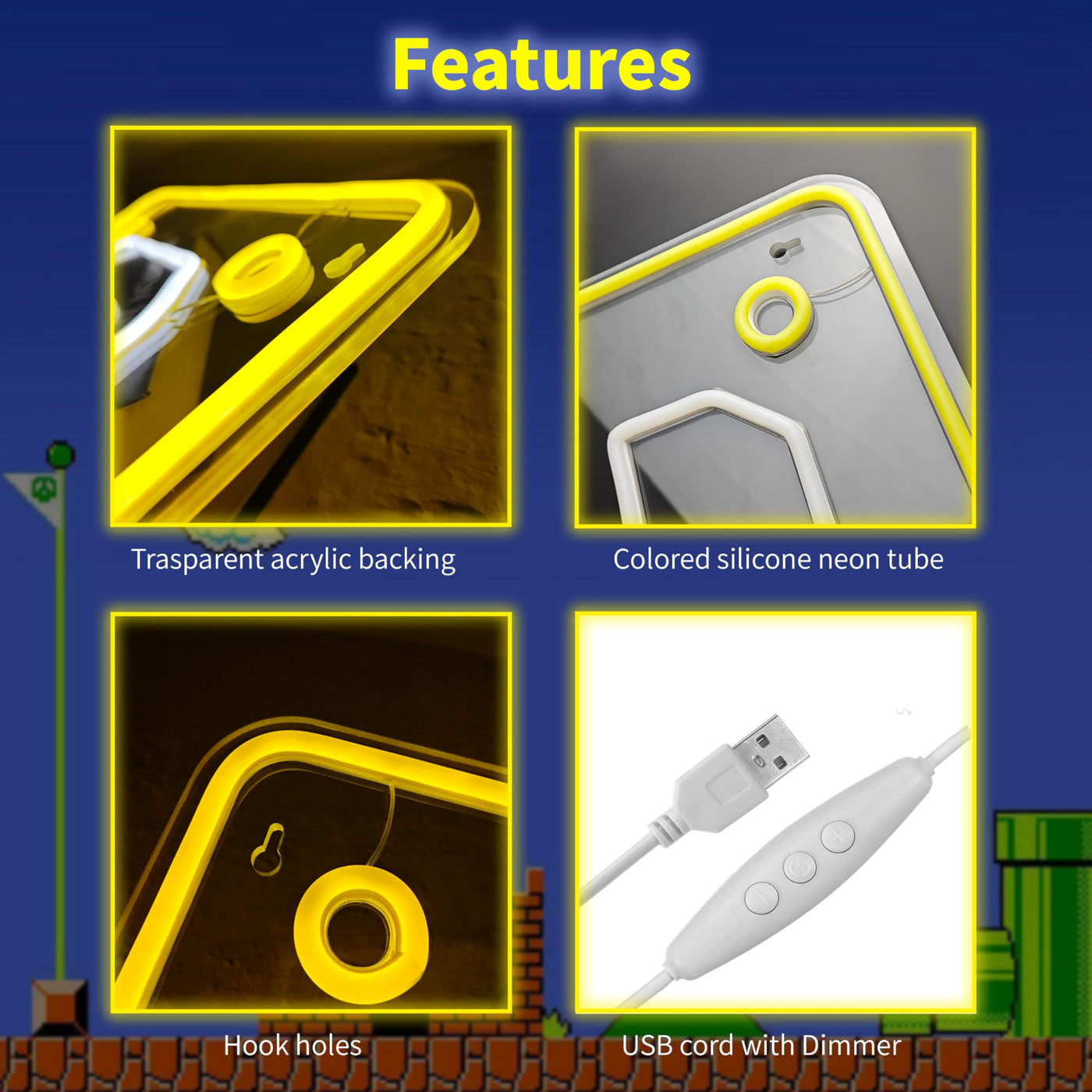 Ma-rio Block LED Neon Light Wall Decor Question Block Dimmable Night Light USB powered with on/off Size of the neon sign:9.84x9.84 inchesColor: white and yellow Material: This Neon Light made of silicone LED tape and acrylic back panel.