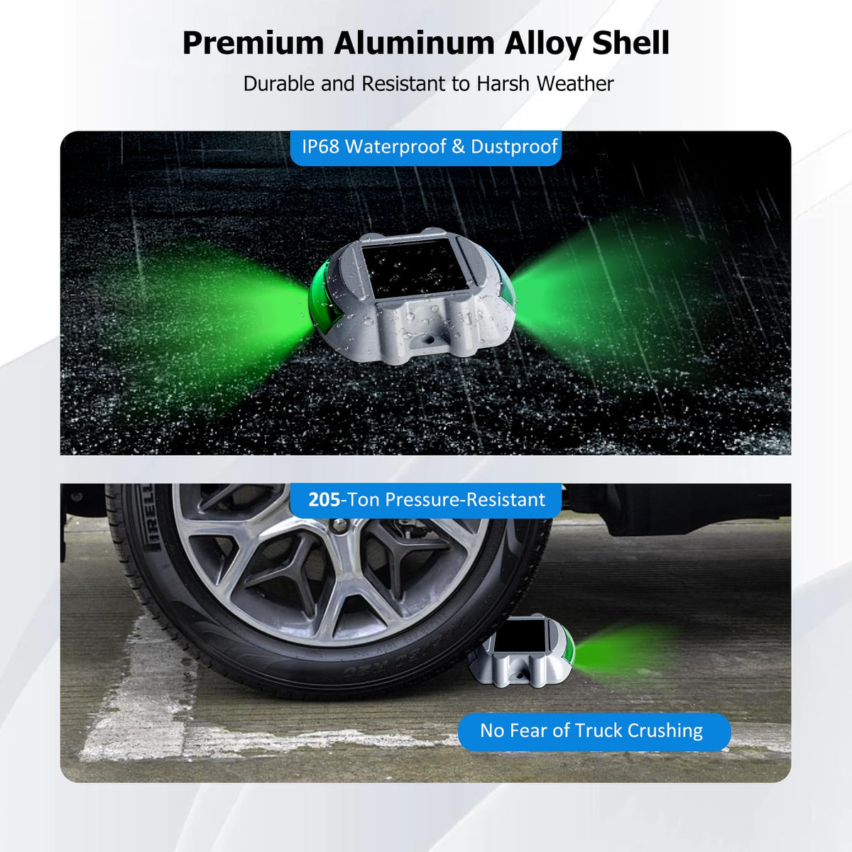 ??SOLAR POWERED CHARGE AUTOMATICALLY? Eco-Friendly Rechargeable solar panels automatically recharge during the day and glow when night falls. Each solar driveway light has 6 LEDs bulbs which give out Intensity and steady light, a built-in 600mAH large battery can provide up to 12 hours of night lighting when in good sunshine charge condition. | ??HIGH QUALITY?The Solar dock light is made of high-quality aluminum casing construction for good resistance to pressure and safety, which can bear a weight of 10 tons. It will not be damaged even the car runs over it. It is can be perfect used for the driveway markers, deck, road, dock, boats, path, driveway, garden, walkway, sidewalk, step, stairs, or courtyard. | ??IP68 WATERPROOF?The driveway lights With IP68 waterproof against any types of terrible weather like a rainstorm, blizzard, or daily heat in a long time. High-quality aluminum materials ensure the light can be used in all kinds of outdoor conditions, even underwater. | ??EASY TO INSTALL?This Solar deck lights can be quickly installed on any ground where they can absorb the sunlight directly. No wiring and operation, you can use the attached screws or glue for fixed installation. | ??NOTE?When using it for the first time, it has to been charged with insufficient sunlight for at least 12 hours, which will better extend the life of the deck light. Our solar lights use high-quality polycrystalline solar panels to make the driveway lights automatically charge during the day for night use.??If you have any problems with the solar deck light, please contact our after-sales service immediately by email, we will provide you with a 6-month warranty and 24-hour customer service.