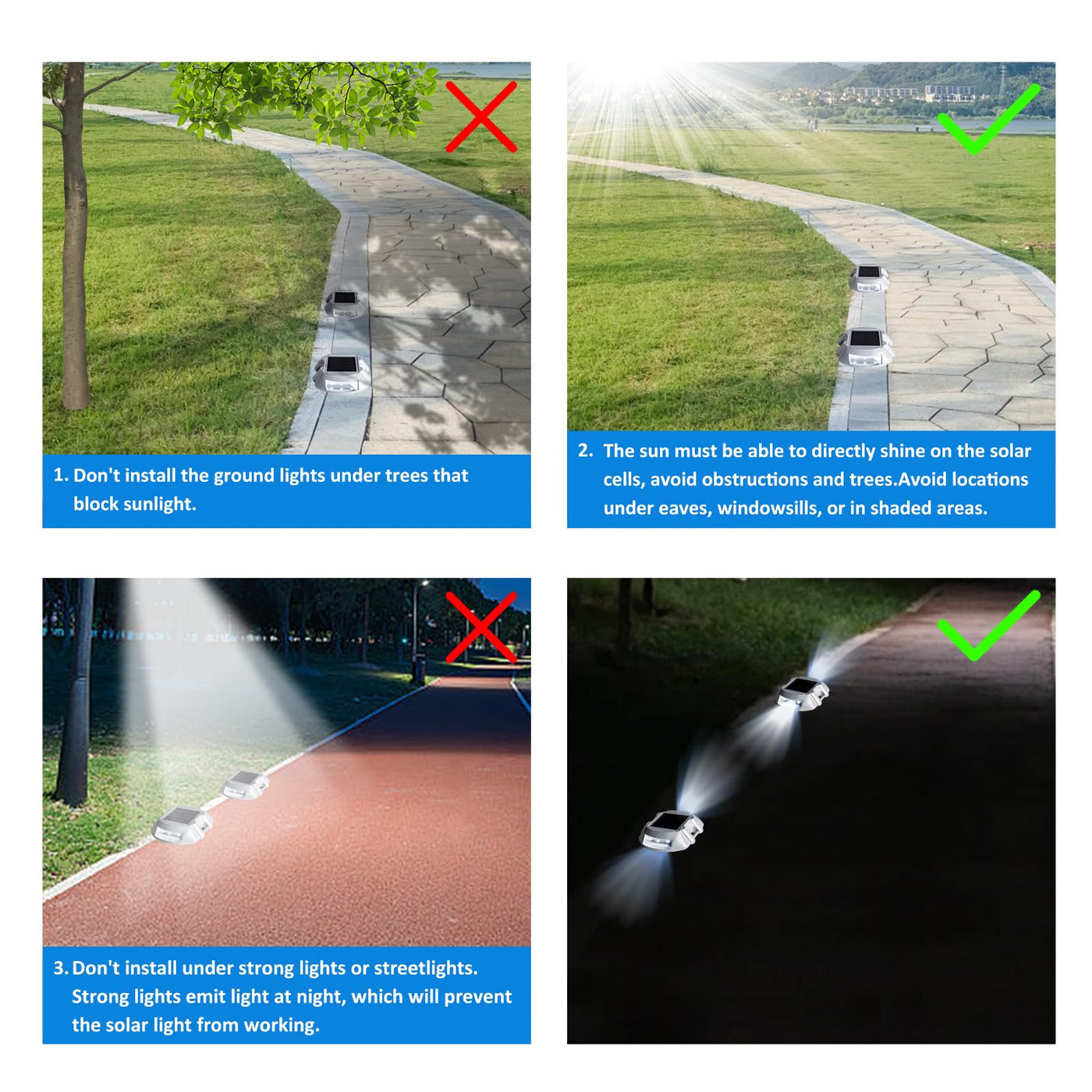 Q: Can these lights be used in different outdoor settings?A: Absolutely! These solar lights are versatile and can be used for driveways, decks, pathways, gardens, docks, and more, enhancing safety and visibility in any outdoor area.