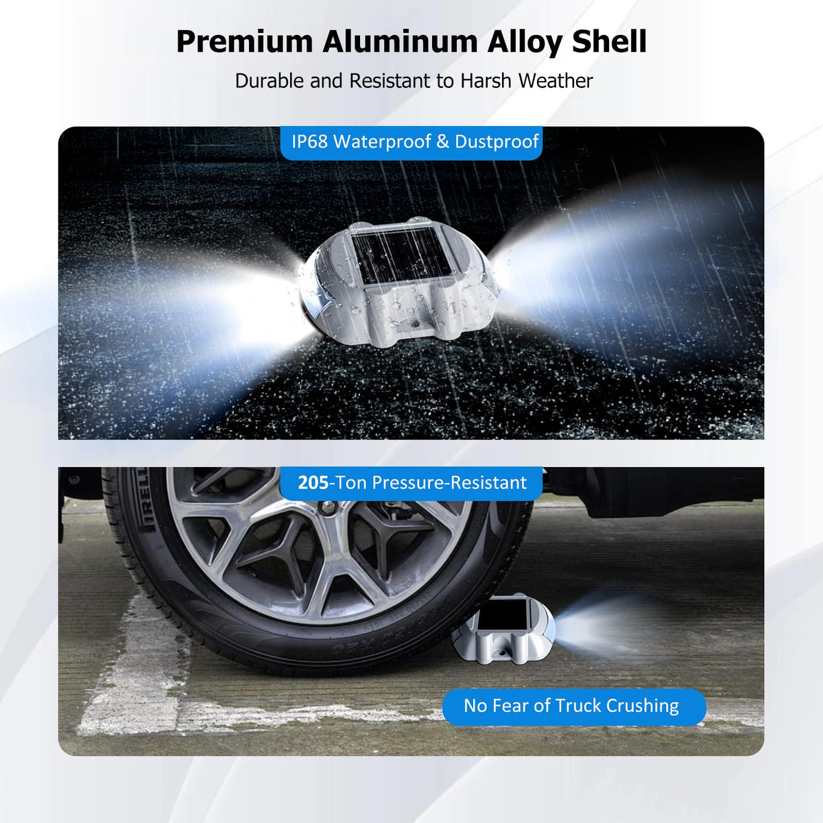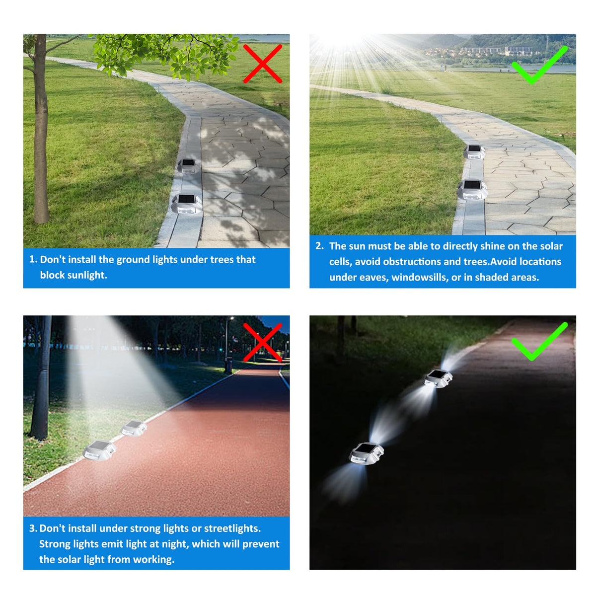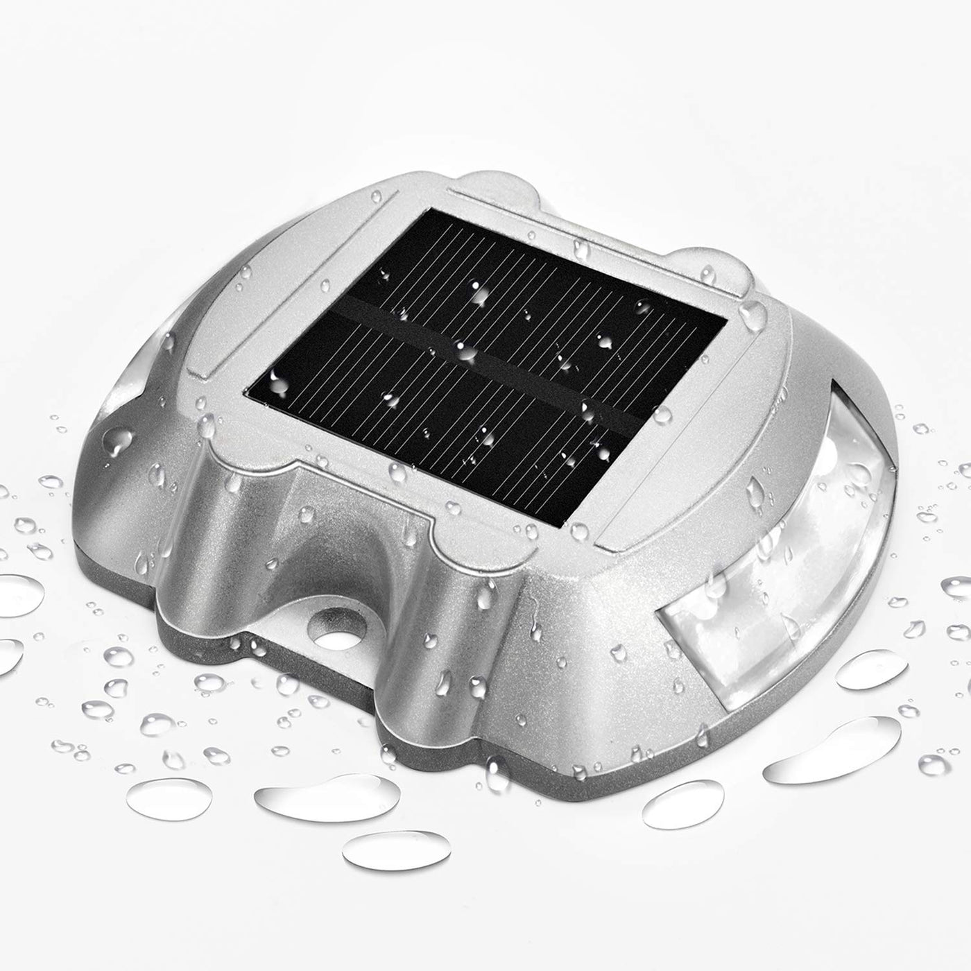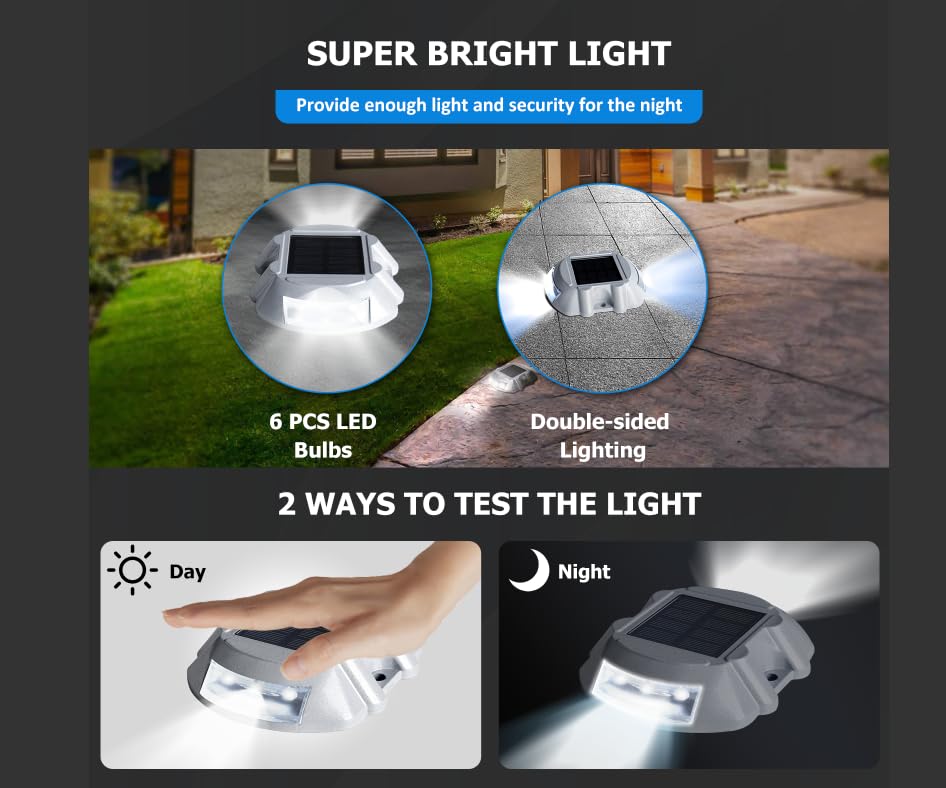 ??SOLAR POWERED CHARGE AUTOMATICALLY? Eco-Friendly Rechargeable solar panels automatically recharge during the day and glow when night falls. Each solar driveway light has 6 LEDs bulbs which give out Intensity and steady light, a built-in 600mAH large battery can provide up to 12 hours of night lighting when in good sunshine charge condition. | ??HIGH QUALITY?The Solar dock light is made of high-quality aluminum casing construction for good resistance to pressure and safety, which can bear a weight of 10 tons. It will not be damaged even the car runs over it. It is can be perfect used for the driveway markers, deck, road, dock, boats, path, driveway, garden, walkway, sidewalk, step, stairs, or courtyard. | ??IP68 WATERPROOF?The driveway lights With IP68 waterproof against any types of terrible weather like a rainstorm, blizzard, or daily heat in a long time. High-quality aluminum materials ensure the light can be used in all kinds of outdoor conditions, even underwater. | ??EASY TO INSTALL?This Solar deck lights can be quickly installed on any ground where they can absorb the sunlight directly. No wiring and operation, you can use the attached screws or glue for fixed installation. | ??NOTE?When using it for the first time, it has to been charged with insufficient sunlight for at least 12 hours, which will better extend the life of the deck light. Our solar lights use high-quality polycrystalline solar panels to make the driveway lights automatically charge during the day for night use.??If you have any problems with the solar deck light, please contact our after-sales service immediately by email, we will provide you with a 6-month warranty and 24-hour customer service.