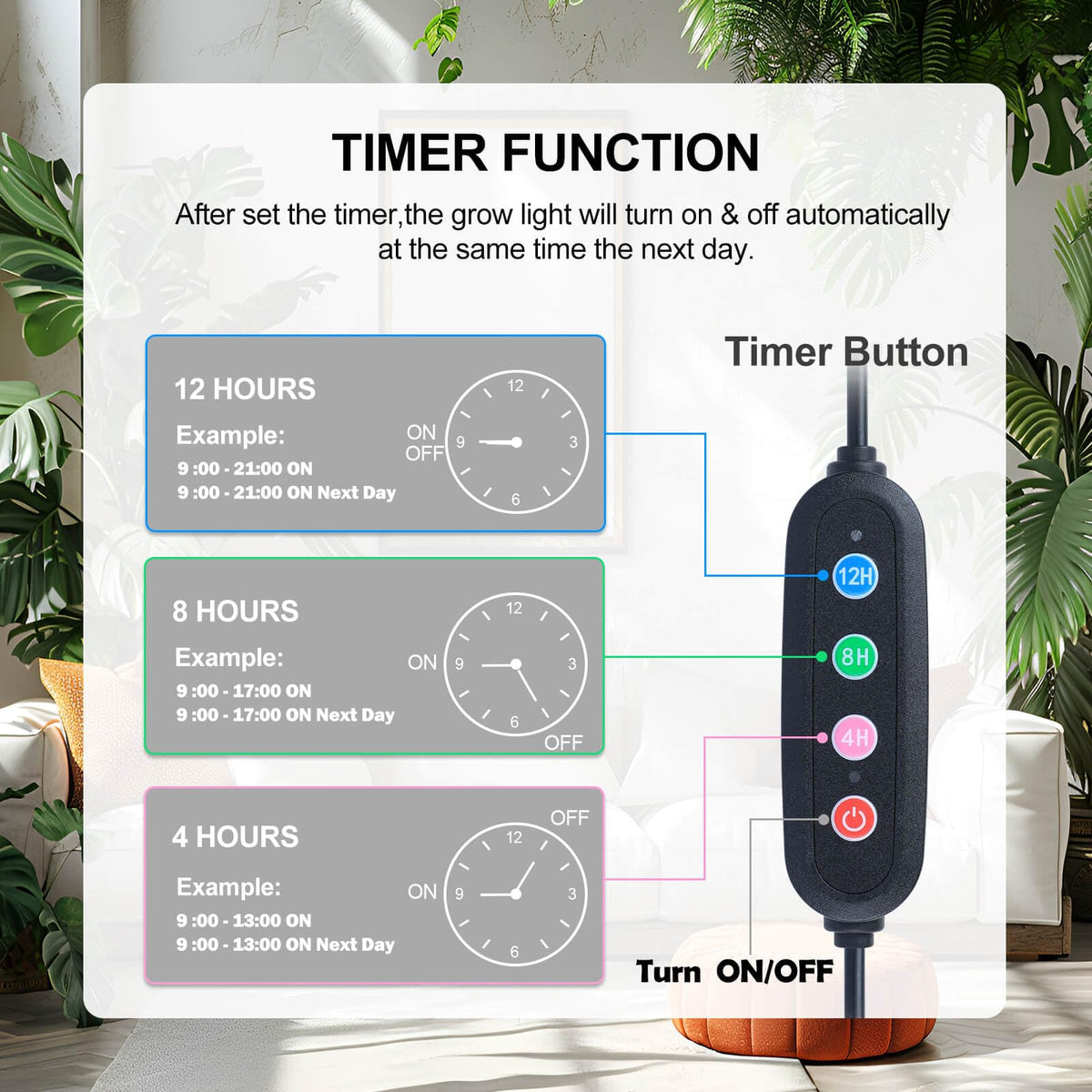 Q: How do the timer settings work on this plant light?A: The plant light includes a timer that allows you to set it to turn on and off automatically for four, eight, or twelve hours, ensuring your plants receive consistent light daily.