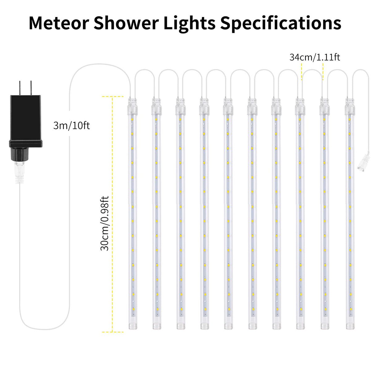 Jjgoo Meteor Shower Rain Lights Led Icicle Snow Falling Christmas Lights - Light Up Whole Winter Season Specification Tube Quantity: 10 Tubes Length Of Each Tube:30Cm/12In Space Between Two Tubes: 50Cm/ 19.7In Length Of Power Cord: 3M/ 10Ft Compatible With Us Standard Outlet (110V) Meteor Shower Effect Jjgoo Rain Lights Act Like A Meteor Shower Or Falling Snow Crosses The Sky. At The Start They Drop At The Same Time And Then There Will Be A Slight Delay Between Each Tube To Run Out Of Sequence Which Is More Natural And Beautiful. Use The Lights Add Fairy And Romantic Atmosphere For Festivals Or Parties. well-made & Long Lifespan Adopt Smd2835 Led Beads Jjgoo Christmas String Lights Is More Brighter And Have Longer Lifespan You Can Hang The Lights Outside Even On Raining Days Perfect For Indoor & Outdoor Decoration Safety Certified & Low Voltage Low Consumption No Over-Heating After Long Time Using. Just Plug It Into The Socket To Turn The Lights On Unplug For Off Super Easy To Operate. The Fairy Lights Is Powered By 7V Low Voltage Plug That Is Lower Than Human Body Safe Voltage For Safe Use Definitely No Risk Of Electric Shock. Compatible With Us Standard Outlet (110V) Permitted In +10%~-10% Fluctuating. Connectable & Extendable The String Lights Is Designed With A Male/Female Plug That Can Be Extenable You Can Connect More Than 2 Strands By Using 1 Plug To Achieve Better Decoration Effect Which Is More Convenient To Use. A Plug Can Connect Up To 4 Meteor Lights To Ensure All Of Them Work Well And Keep The Best Brightness.It Will Be Long Enough To Decorate Almost Everywhere After Connected Together. Waterproof For Outdoor Use The Tubes Are Made Of enhanced Pv Material And The Connection Point Is Well Sealed Which Is Waterproof Corrosion Resistant Dust Proof Aging Resistant And More Durable.